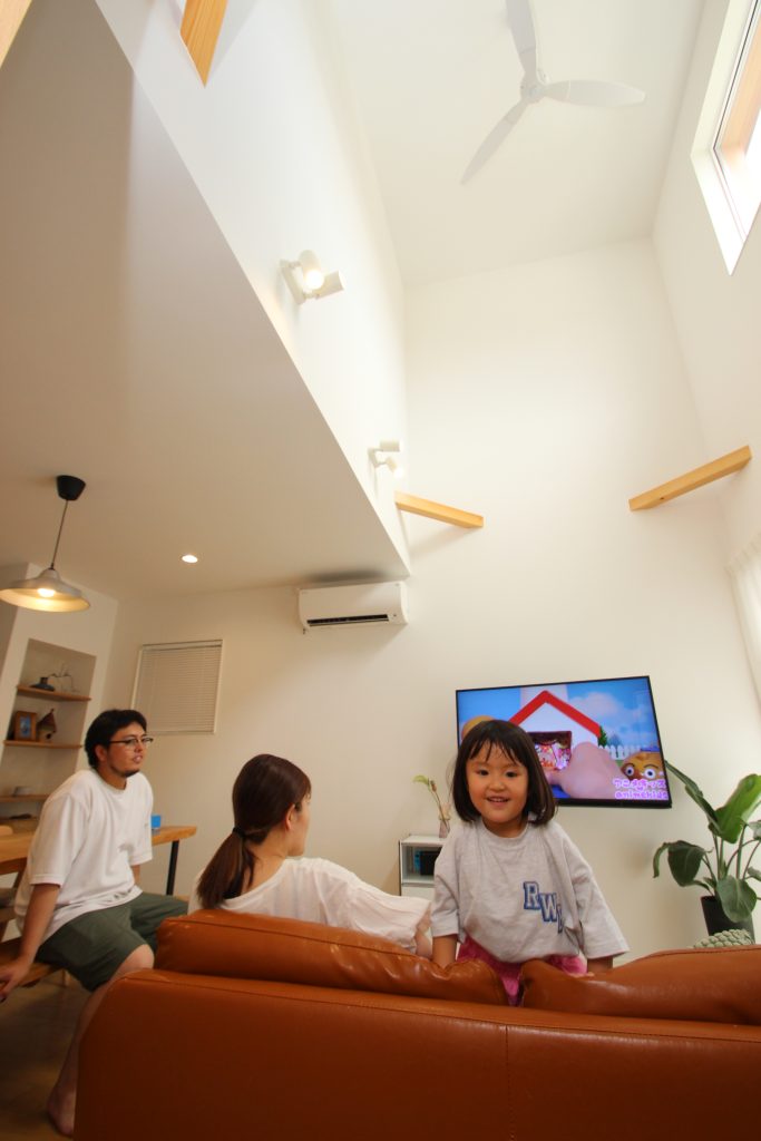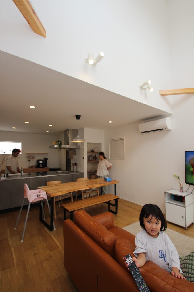 開放感のある吹き抜けリビングと天井高を下げたダイニングキッチンで、メリハリを付けたLDK。白を基調に木質感あふれる天然木のフローリングや木製インテリアを配した癒しに満ちた空間です。
