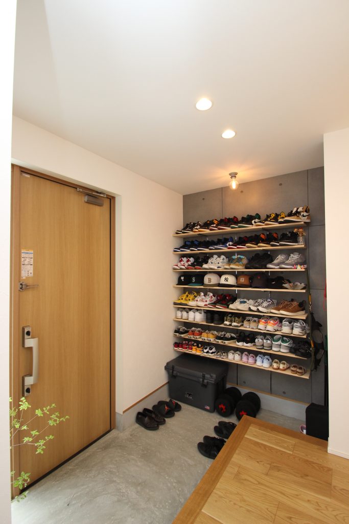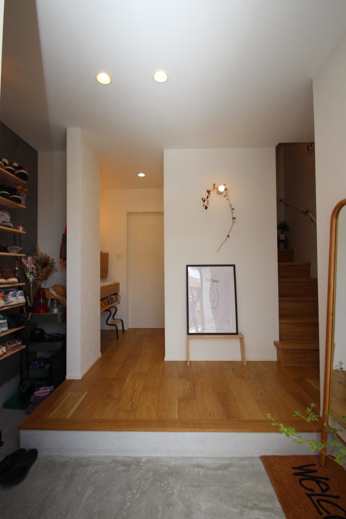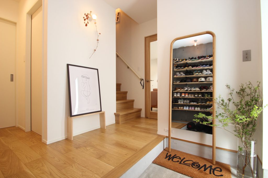 エントランスには玄関スペースの広がりが際立つ、オープンタイプの土間収納。入ってすぐ左手に洗面、右手に階段とLDKの入り口があり、玄関から複数の動線がのびています。帰ってすぐ手洗いができるのも◎