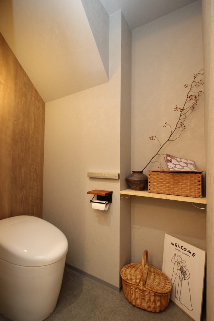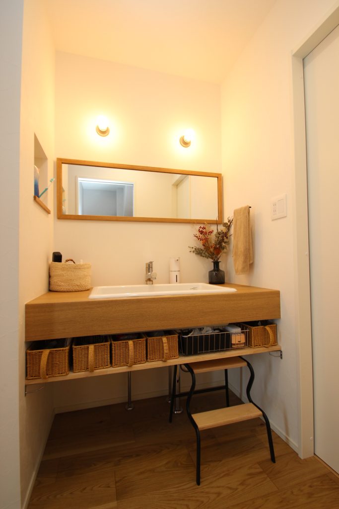 造作洗面台やトイレも木の風合いを楽しむ素材をチョイス。洗面所と脱衣所の間に扉があるセパレートタイプなので来客中も気兼ねなく入浴や着替えができます。