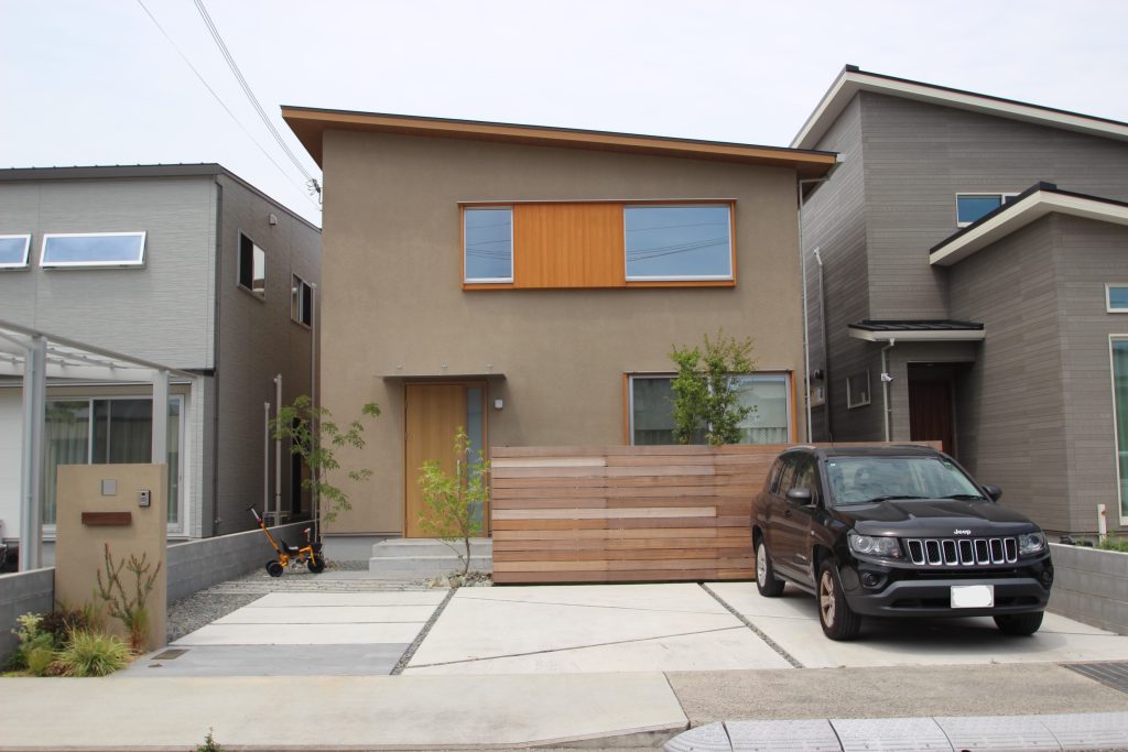 アースカラーの塗り壁(ジョリパットネオ)と、木をふんだんに取り入れた外装で、モダンなフォルムでありながら温かみのある佇まいに。デザインのポイントになっている窓枠と羽目板は明るいピニー色の塗装。