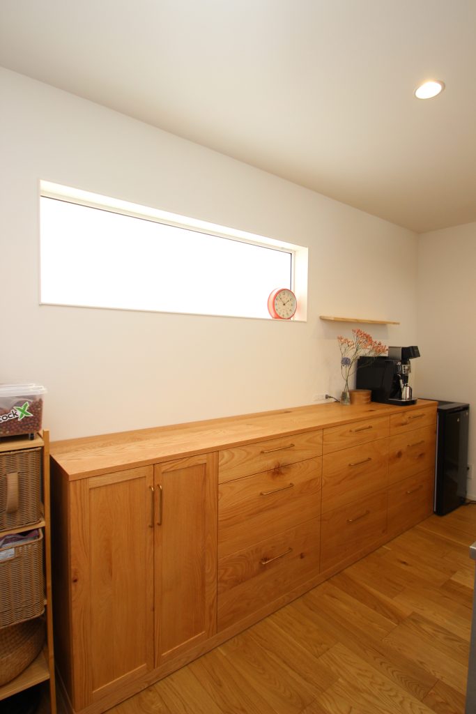 カップボードはインテリアショップでオーダーメイドしたもので、木の素材感を活かした空間に合うデザインです。設計時には、カップボードの納まりなども考えてプランニングしてもらいました。