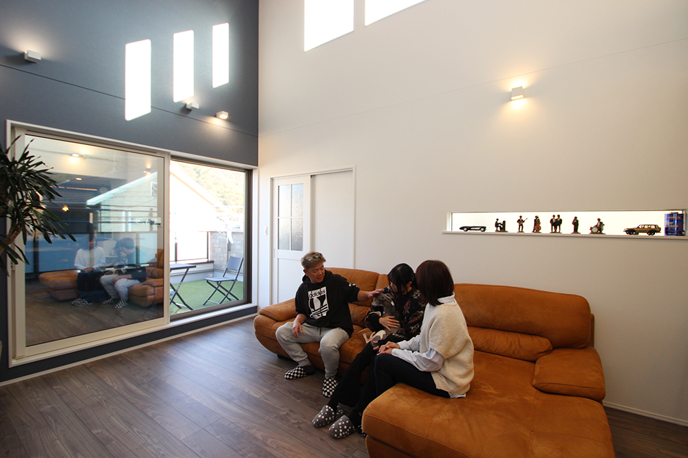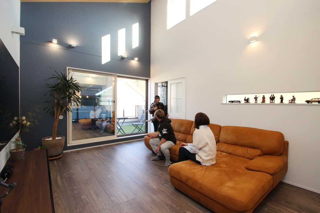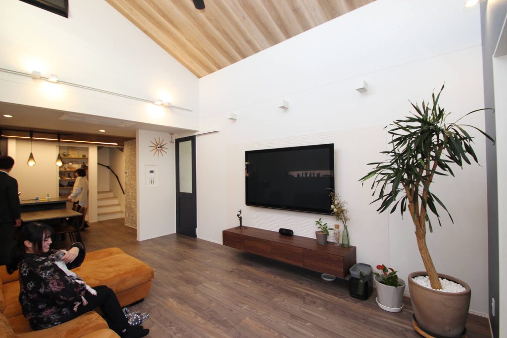 吹き抜けの勾配天井で、明るく開放的なリビングを計画。家族がゆったりくつろげる空間をつくりました。