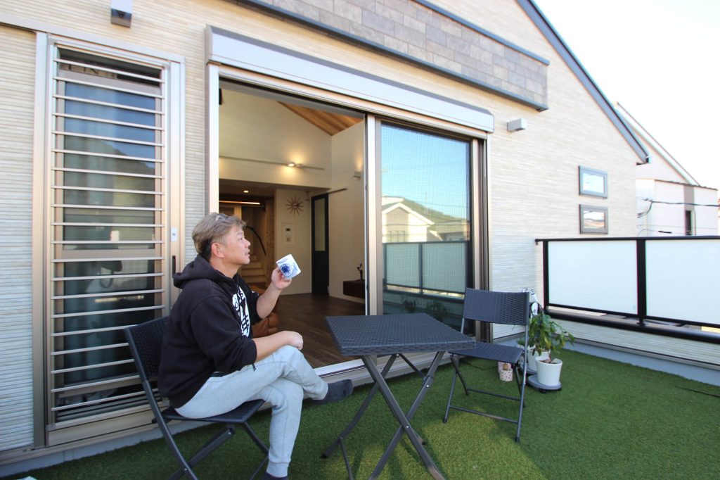 ご主人の希望でテラスをリビングからフラットにつなげました。休日は家族でバーベキューを楽しんだり、夜風を感じながら読書をしたり——内と外が緩やかにつながる時間が生まれました。