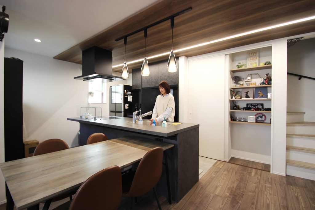 キッチン上部の意匠はご主人のこだわり。木目の通りを大切にし、空間全体のトーンを整えました。アイランド型キッチンは奥様のお気に入りで、調理をしながらリビング全体を見ることができるのが魅力です。