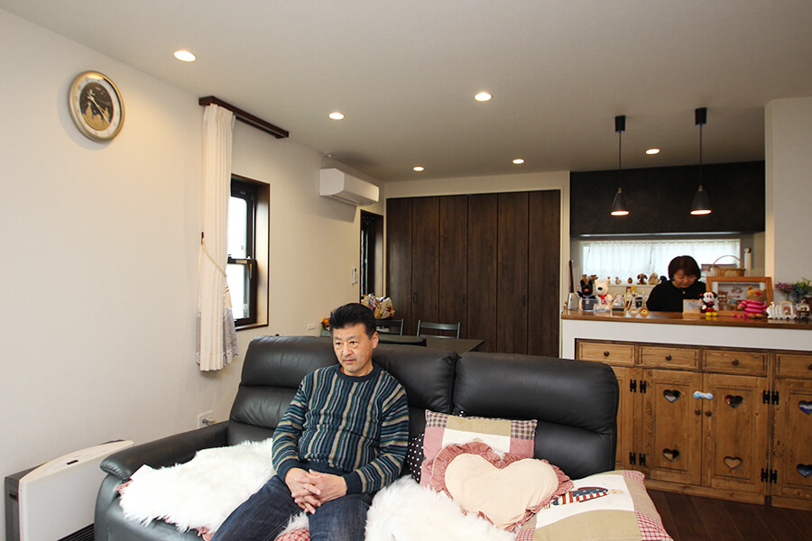 奥様:キッチンとリビング。孫たちが来てもみんなで集まれて、3世代で楽しく過ごしています。