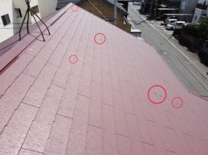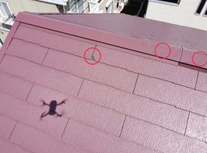 コロニアル屋根が何ヶ所も欠けていたり、写真ではわかりにくいですがヒビ割れも複数ありました。