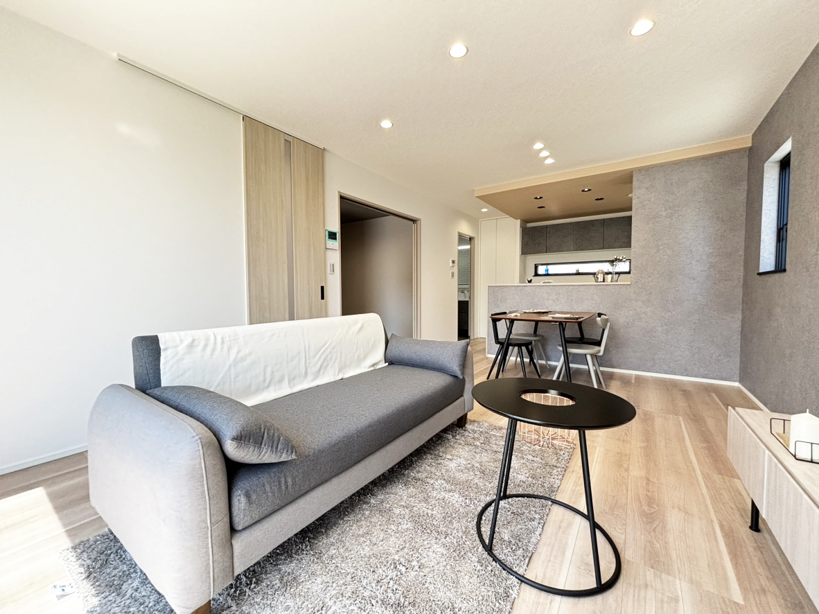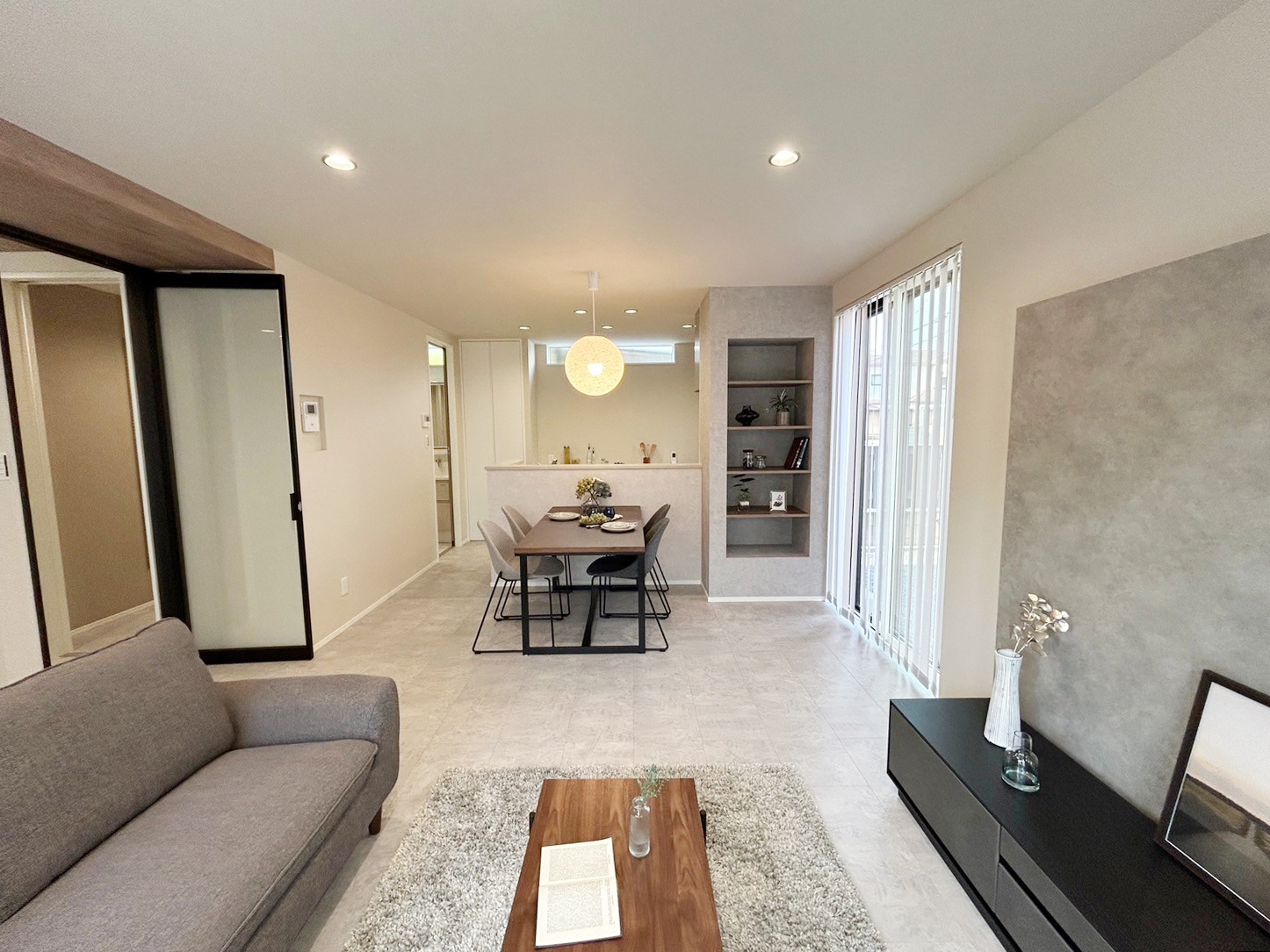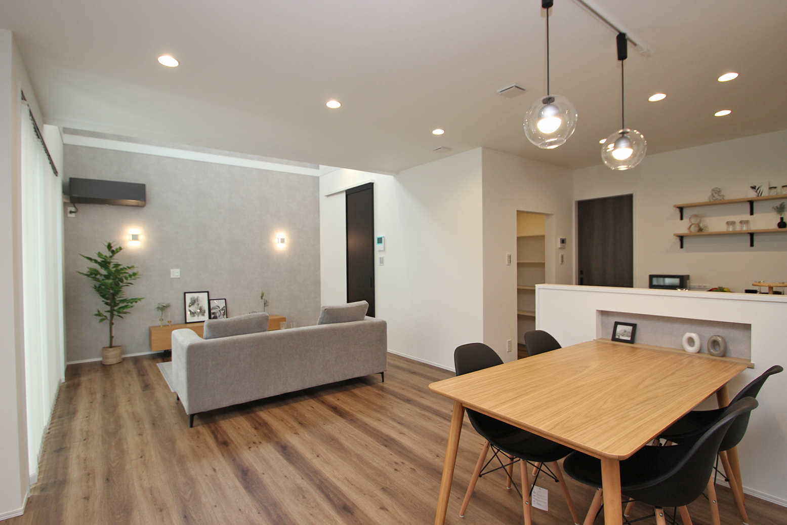 木目×石目タイルを壁いっぱいに張り分けたおしゃれなLDK