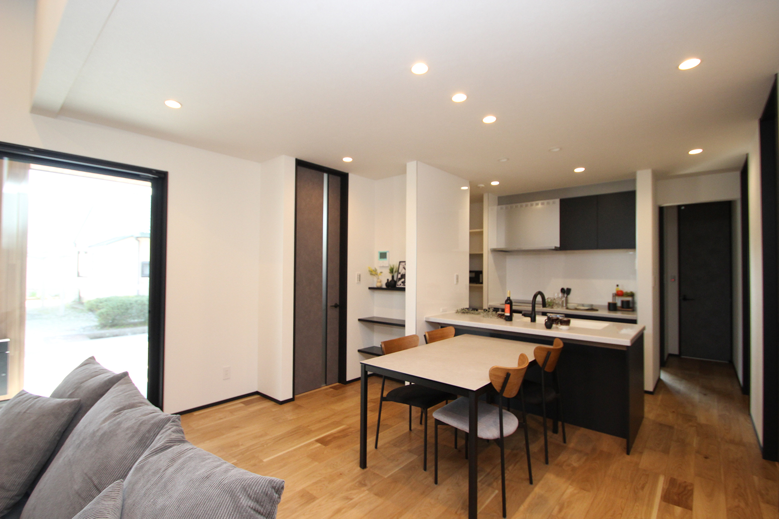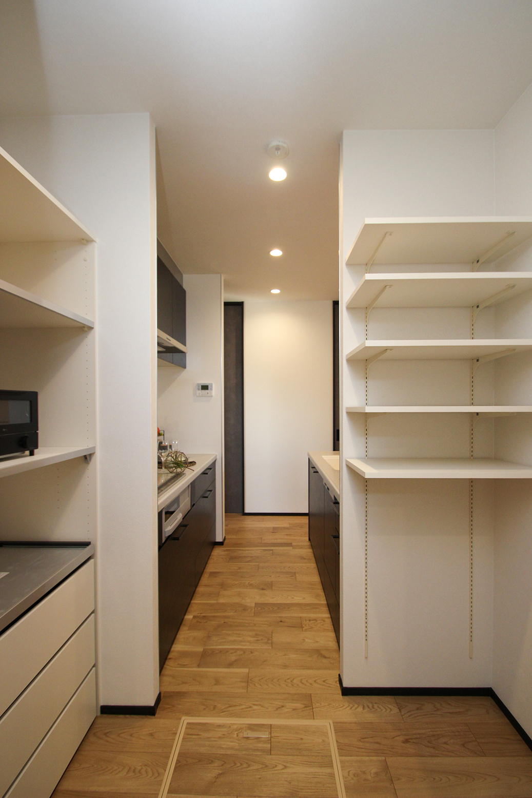 老後も安心◎LDKや水回り、主寝室などがすべて1階に。生活空間が整った半平屋の住まい。作業スペースが広く、家事動線が短いⅡ型キッチンで家事がスムーズ。すぐ横に水回りとパントリーがあり、すべての動線が短く家事効率アップ。