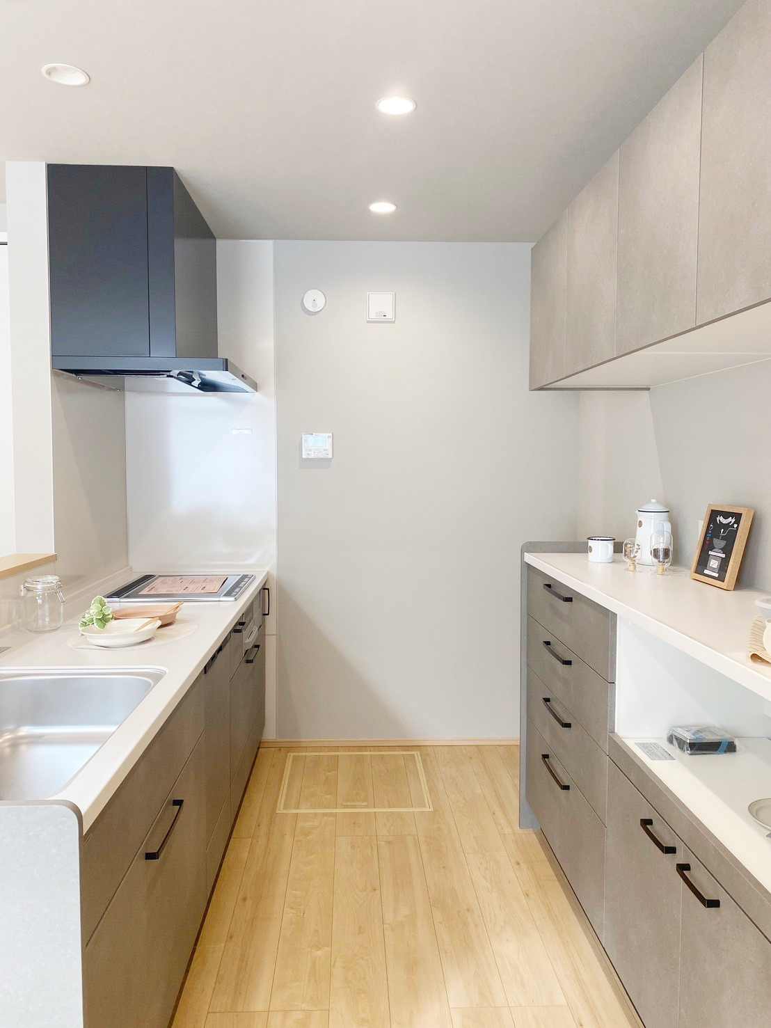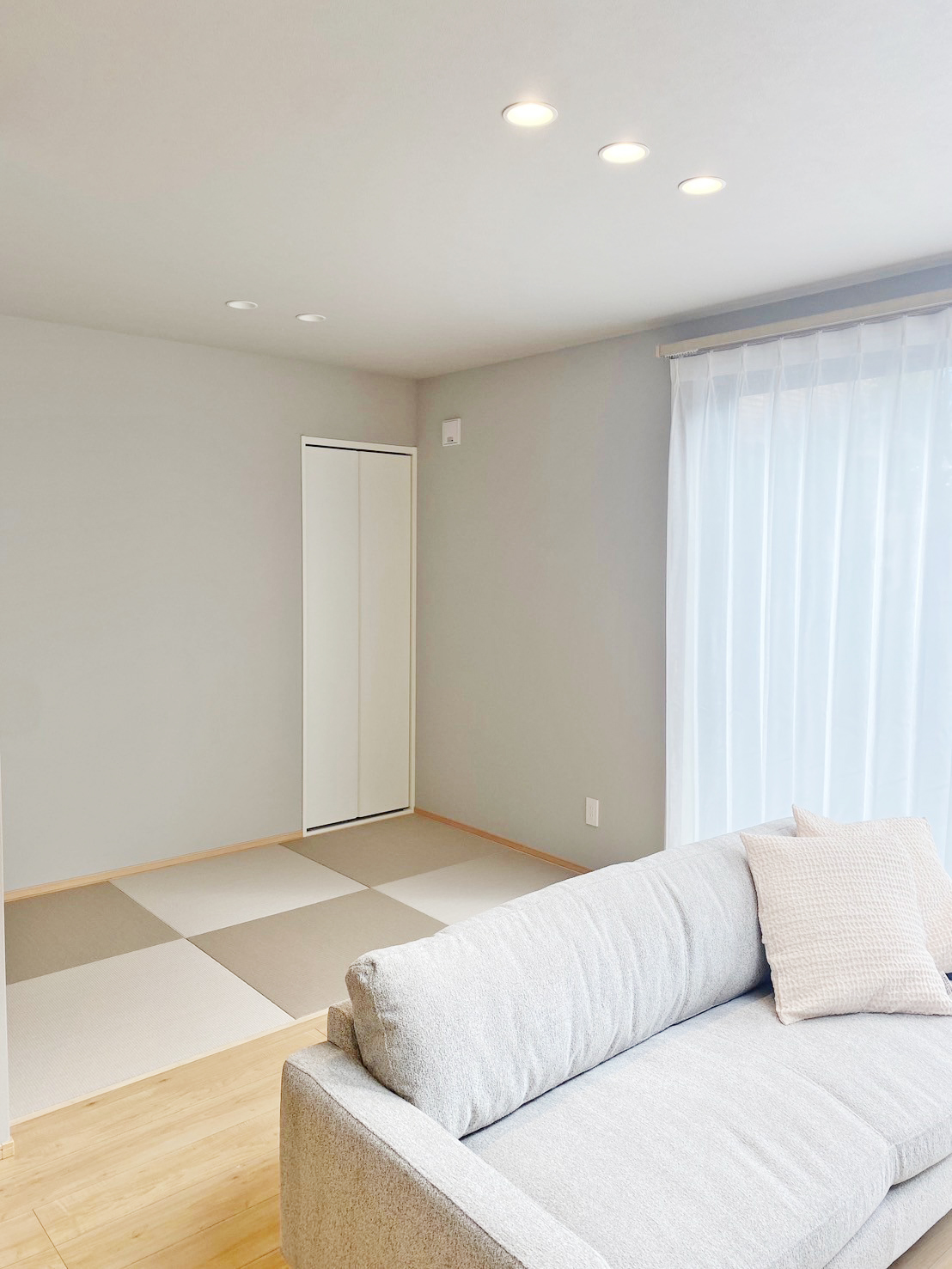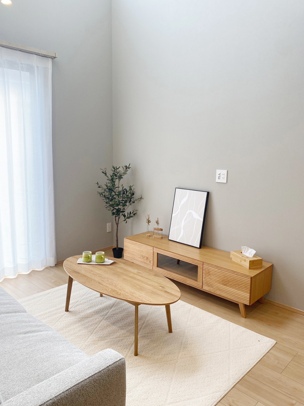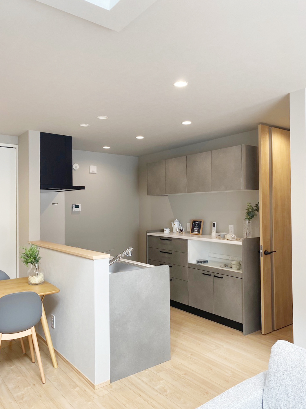ベースクロスにグレーカラーの壁紙を採用したリビングは落ち着きある空間。上部吹き抜けから降り注ぐ陽が部屋の隅々まで届くため暗くならず開放感のあるリビングに。明るい色味の家具やフローリングと調和してナチュラルさも感じられる優しい雰囲気◎