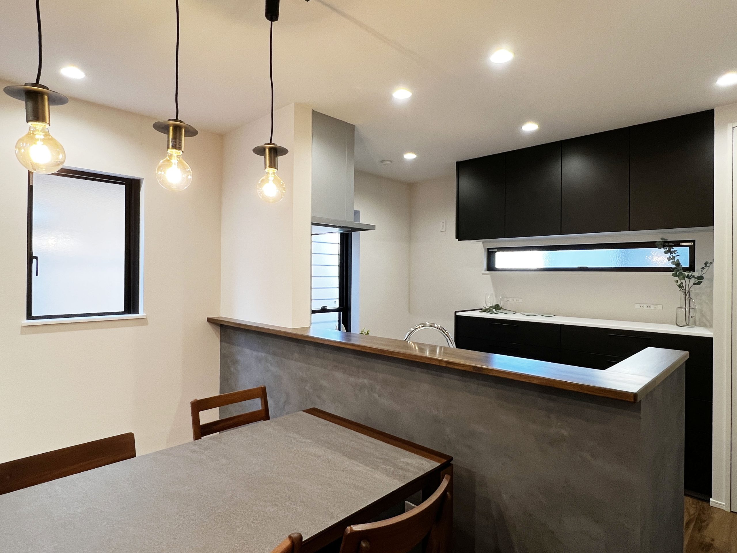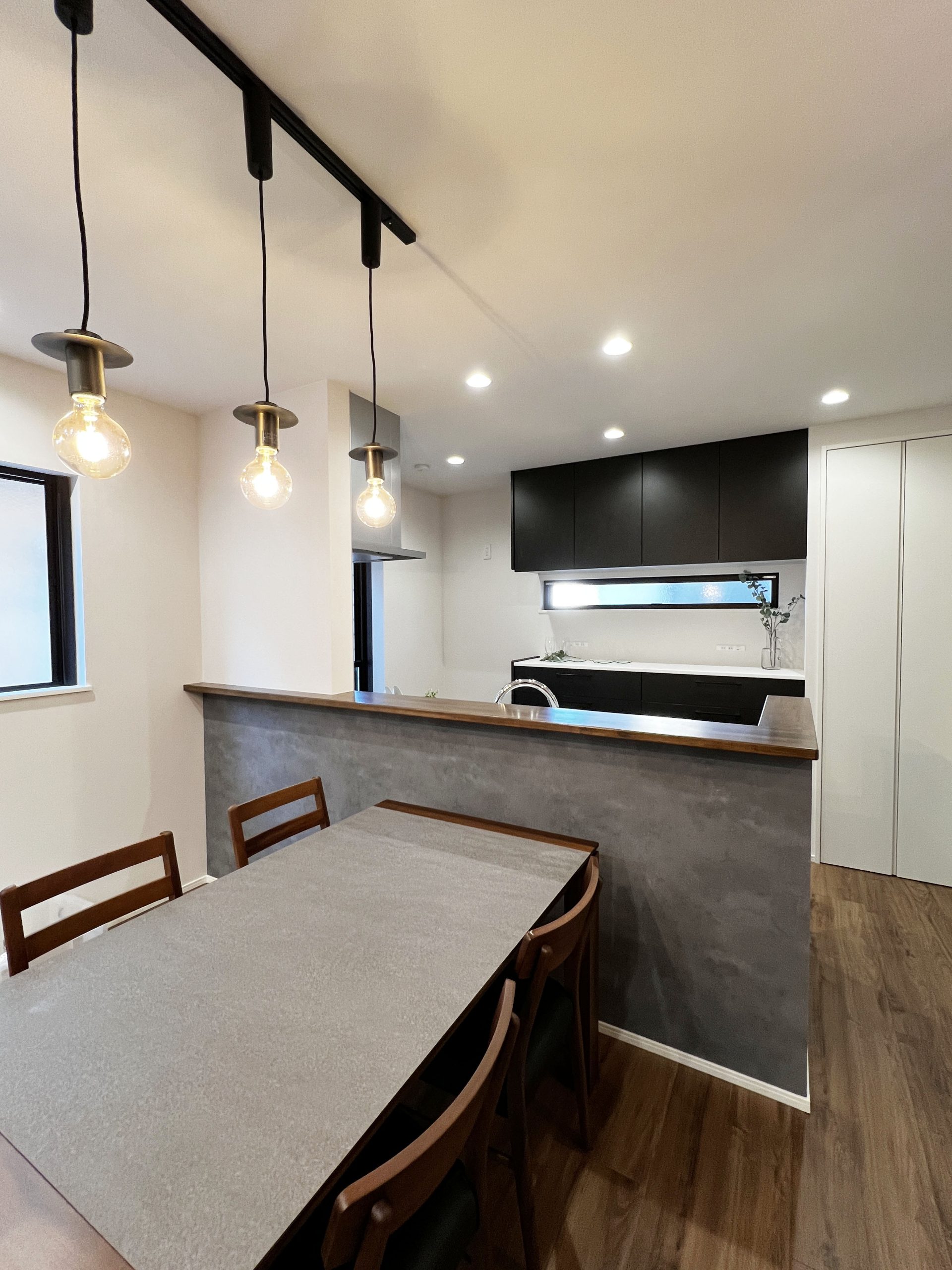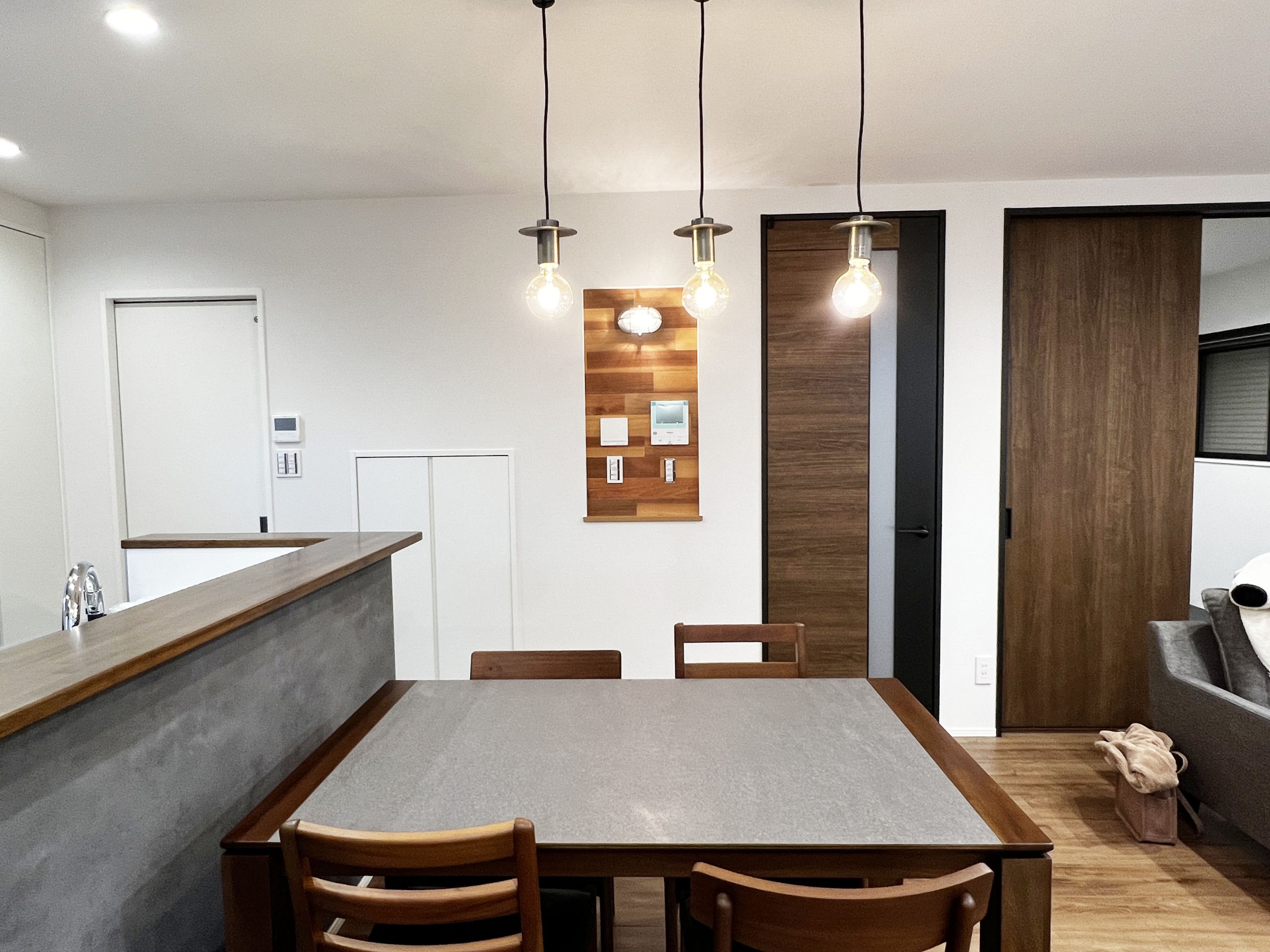 レッドシダー調のクロスや真鍮古味仕上げのペンダントライトをアクセントにして重厚な雰囲気になりすぎないようにコーディネート。キッチン、洗面脱衣室、浴室が横並びの家事楽動線で毎日の家事がラクに。