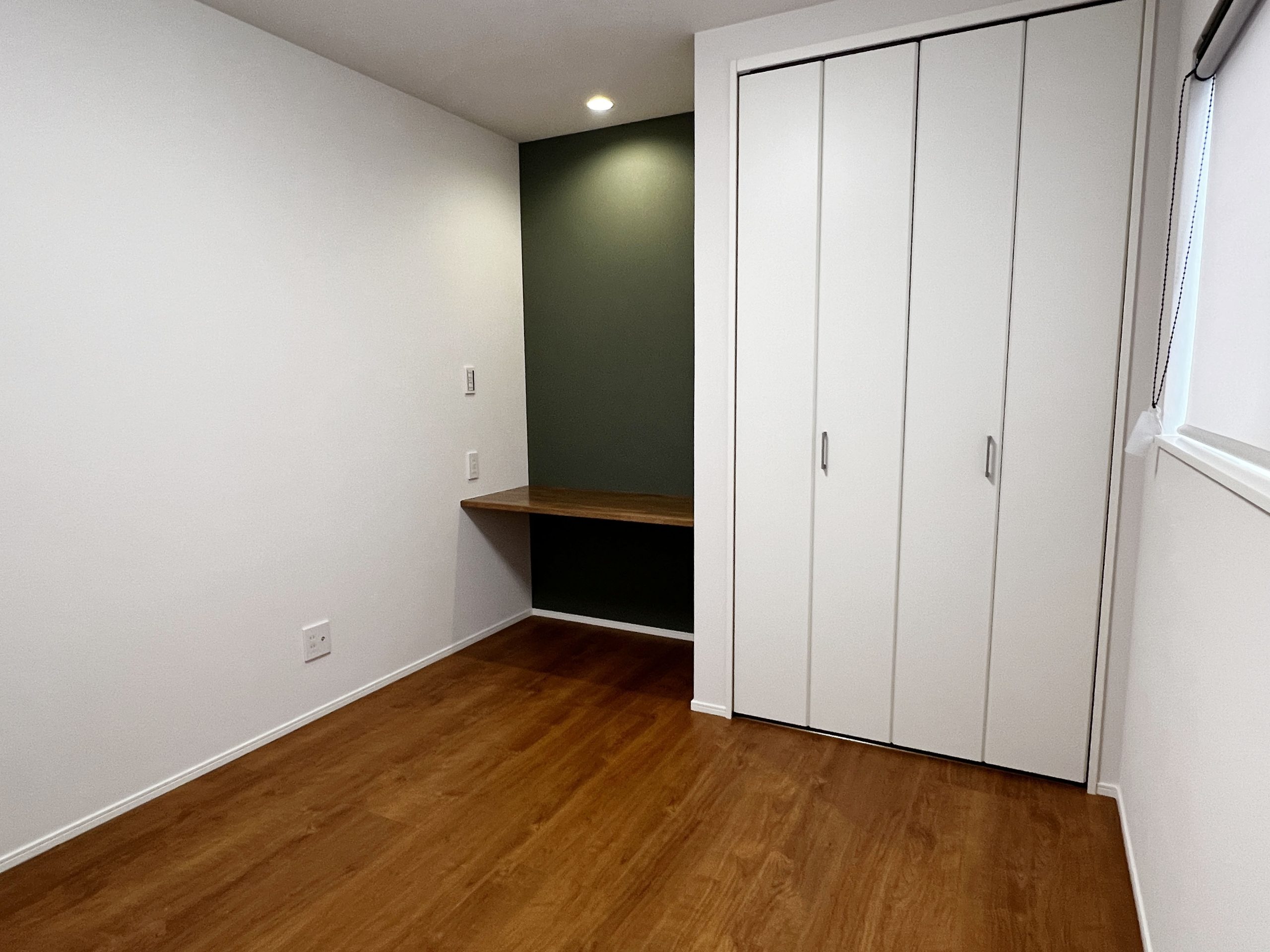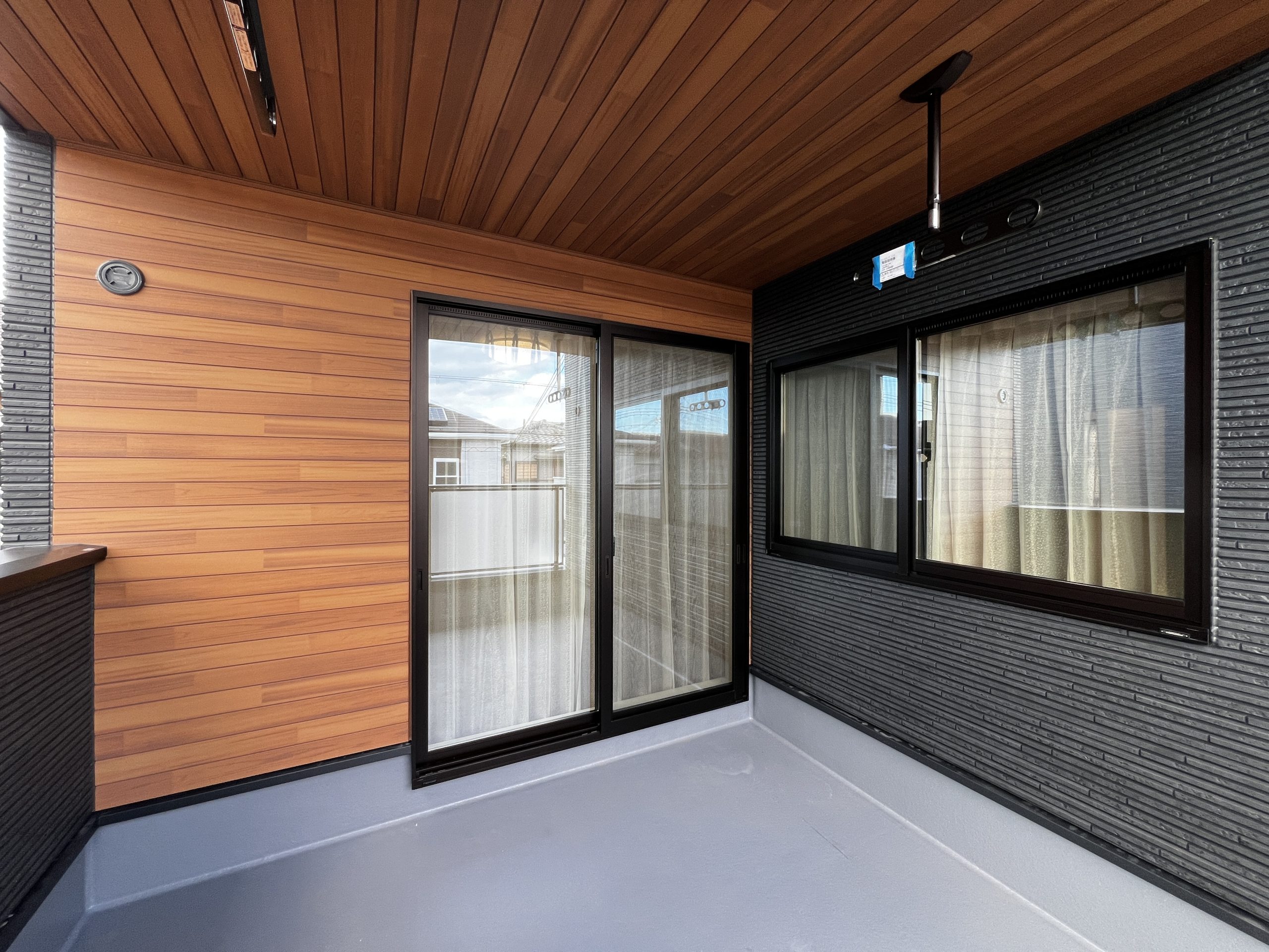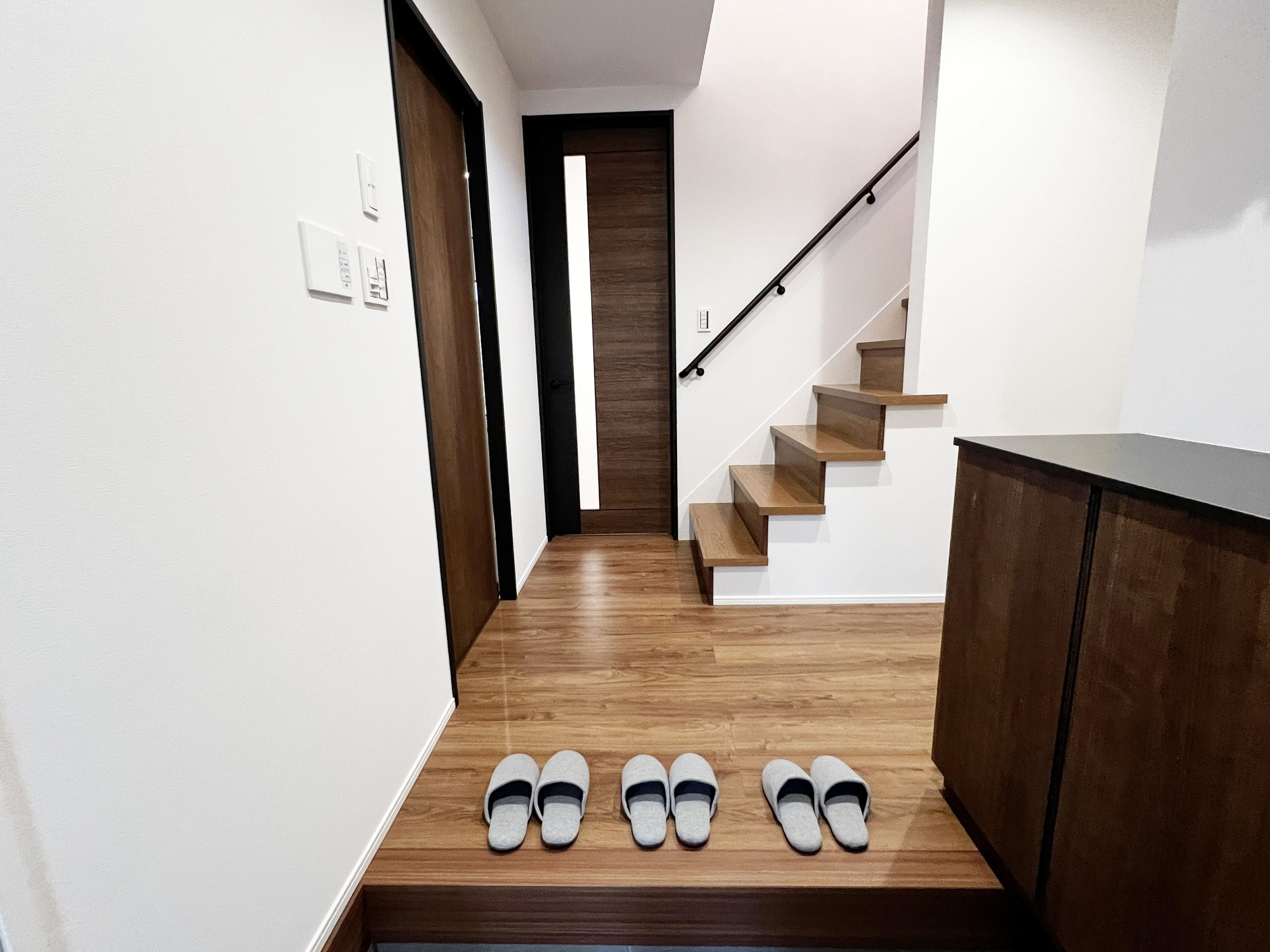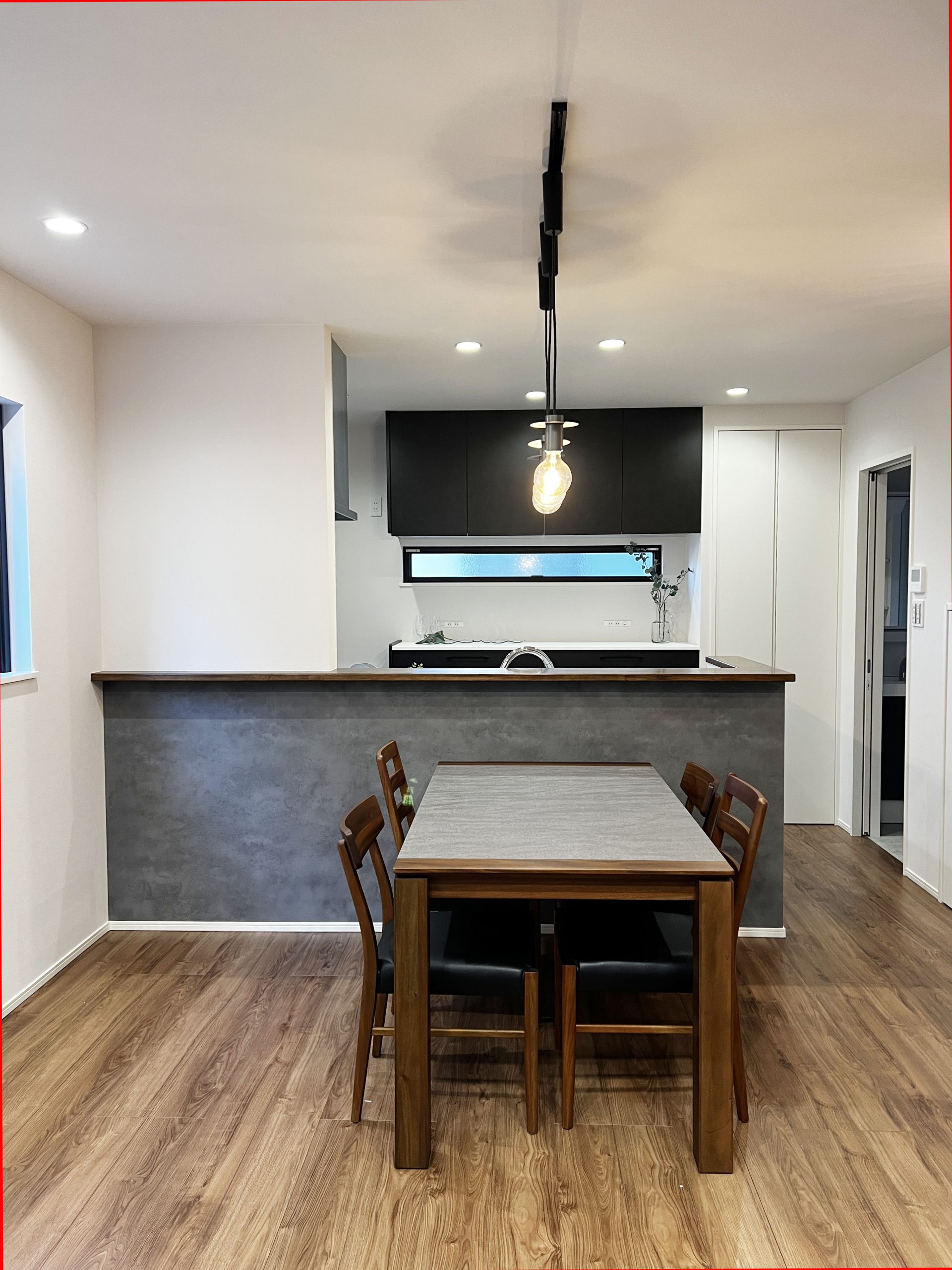 レッドシダー調のクロスや真鍮古味仕上げのペンダントライトをアクセントにして重厚な雰囲気になりすぎないようにコーディネート。キッチン、洗面脱衣室、浴室が横並びの家事楽動線で毎日の家事がラクに。
