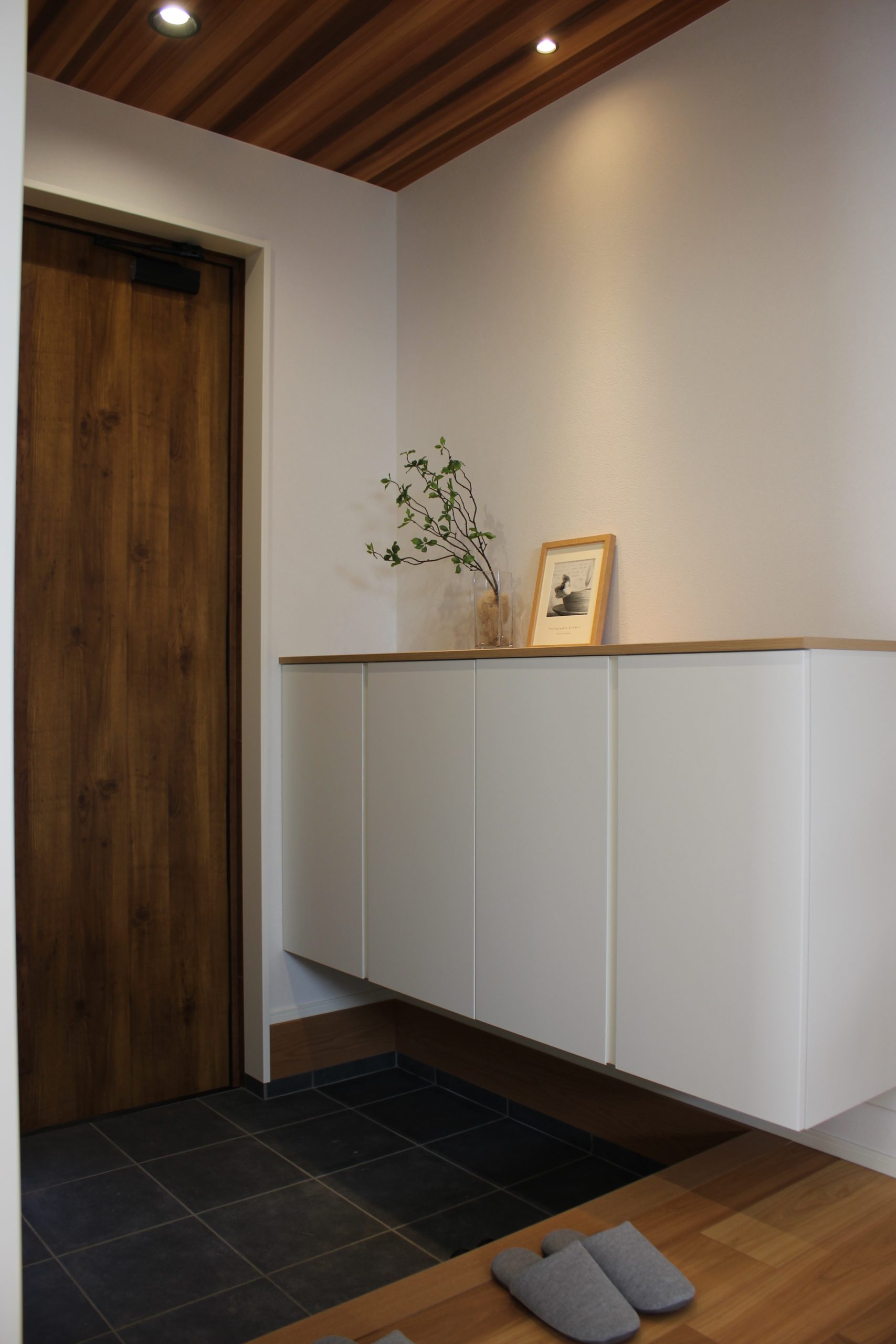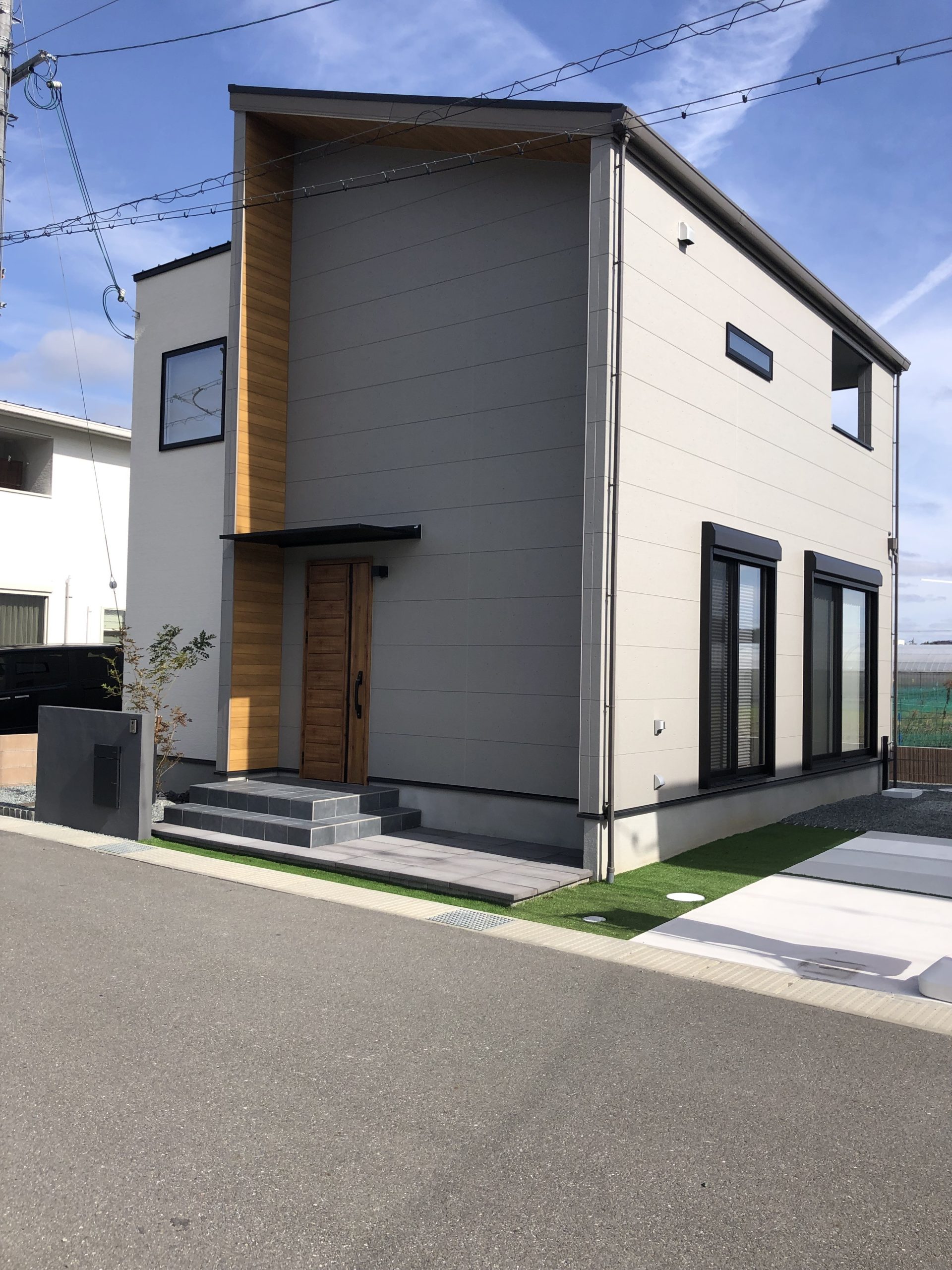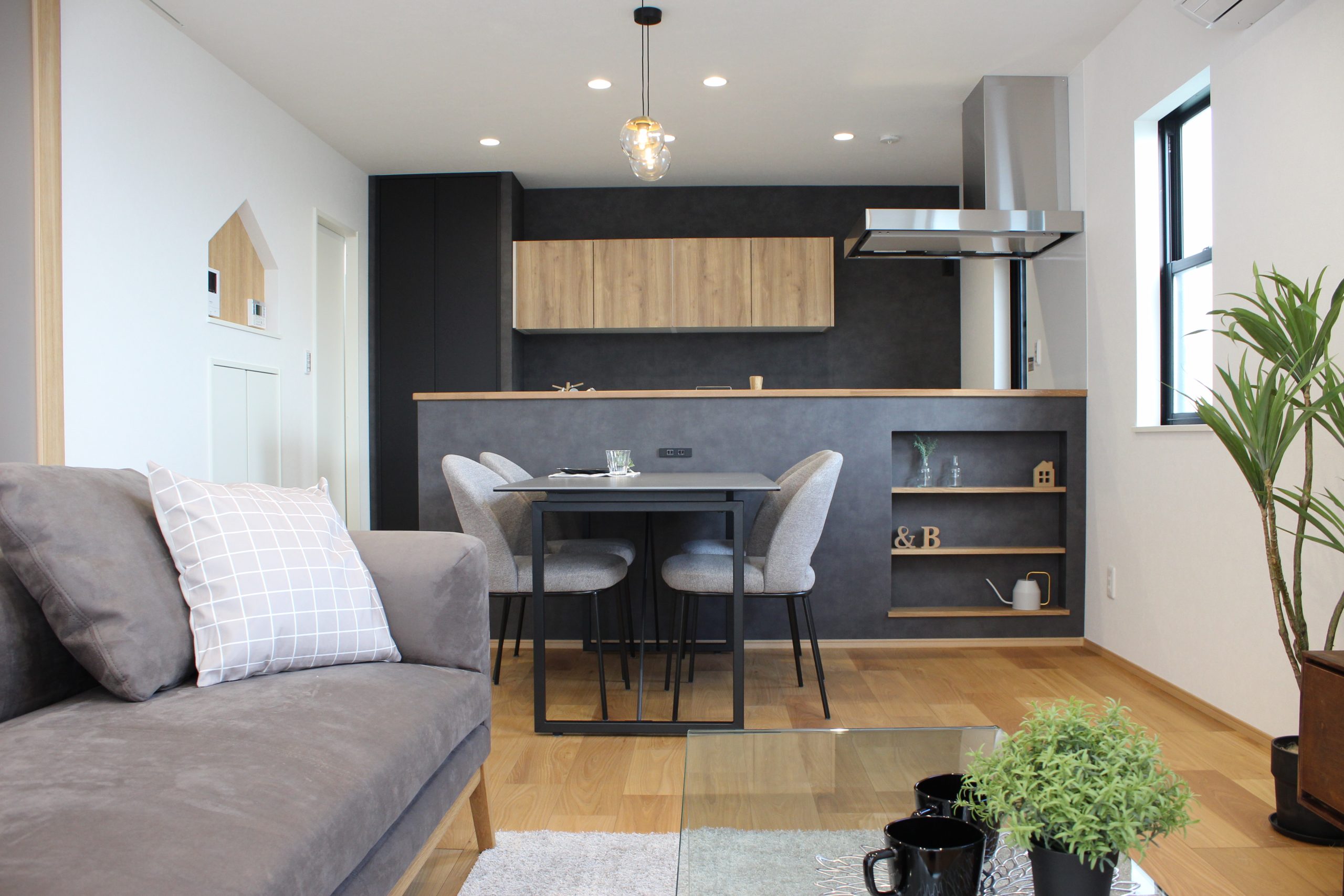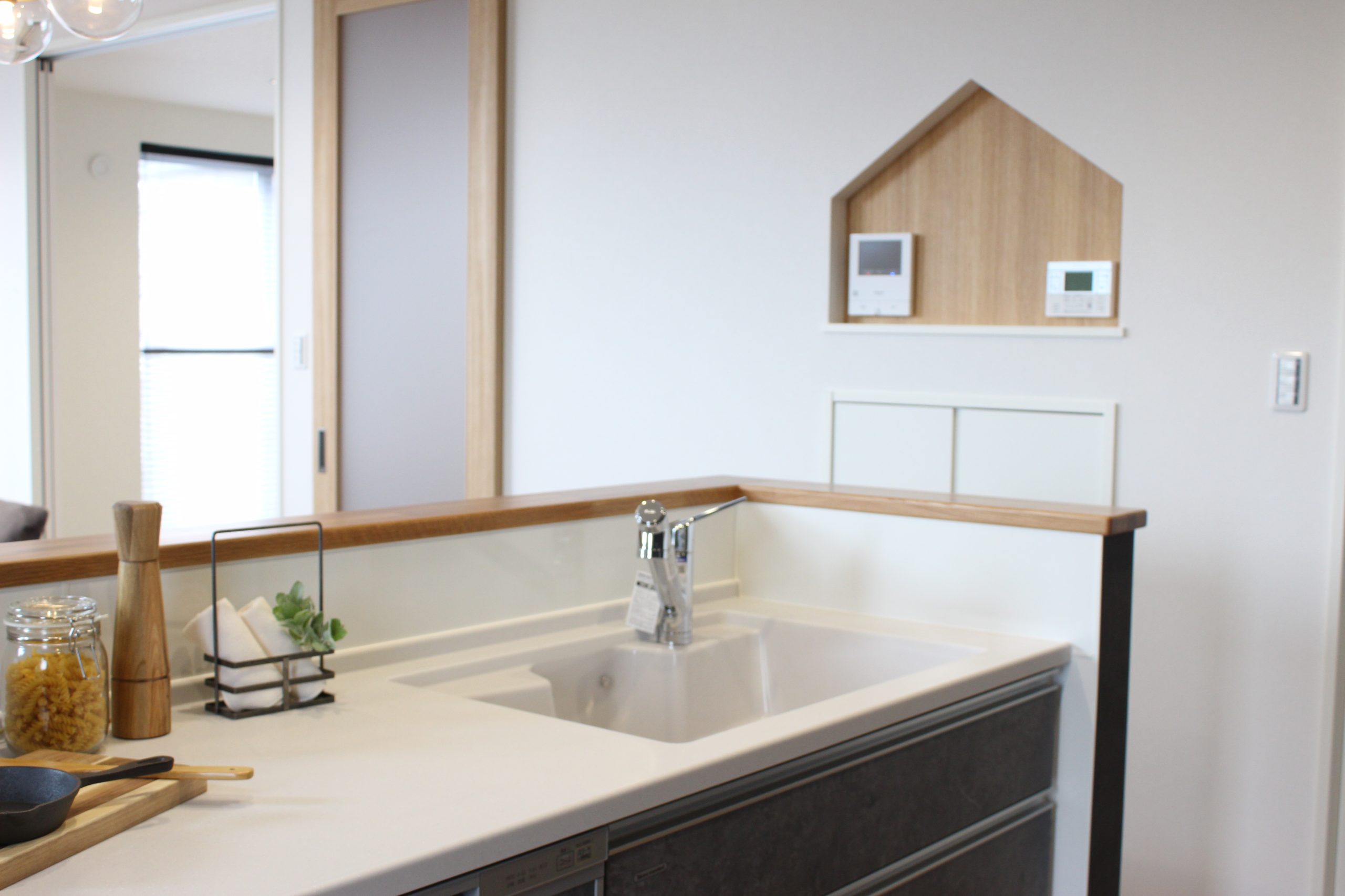 モノトーンカラーに木目が映えるオシャレなキッチン。リビング全体を見渡せる対面式で子育ても安心◎一直線上に水回り設備が位置しており、キッチン横には勝手口も。家事効率アップに繋がる間取り。
