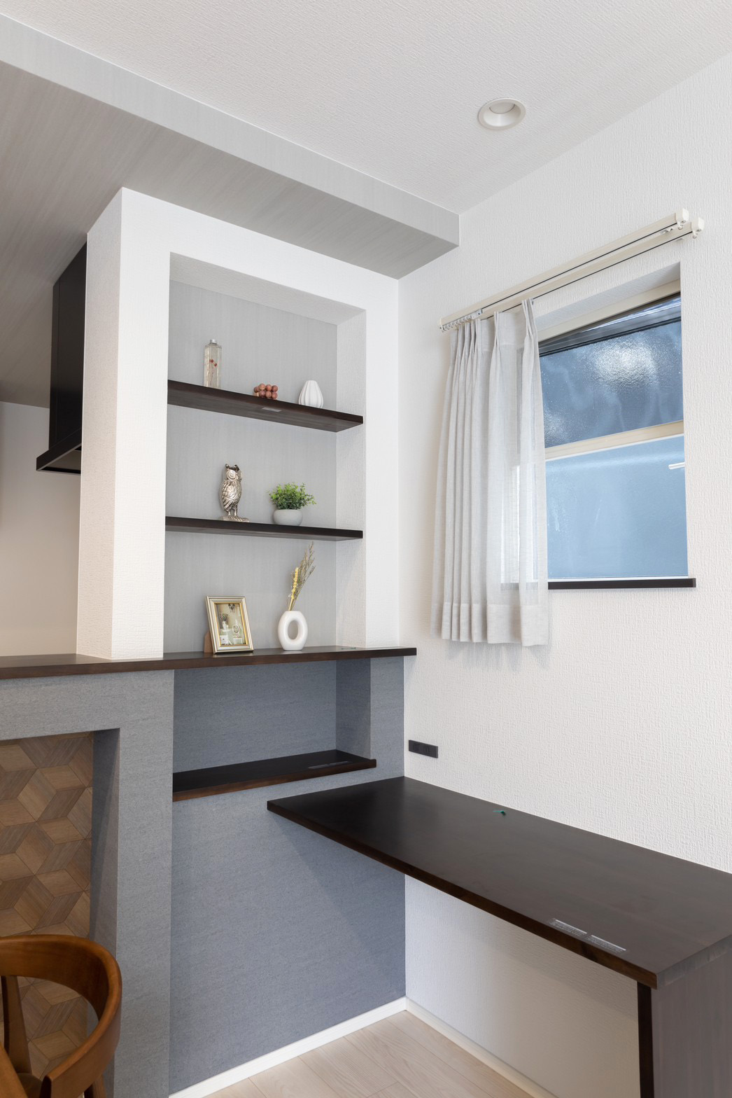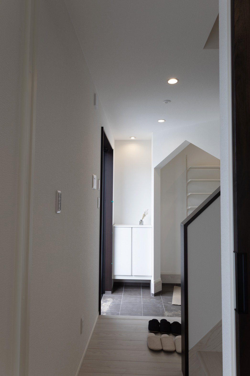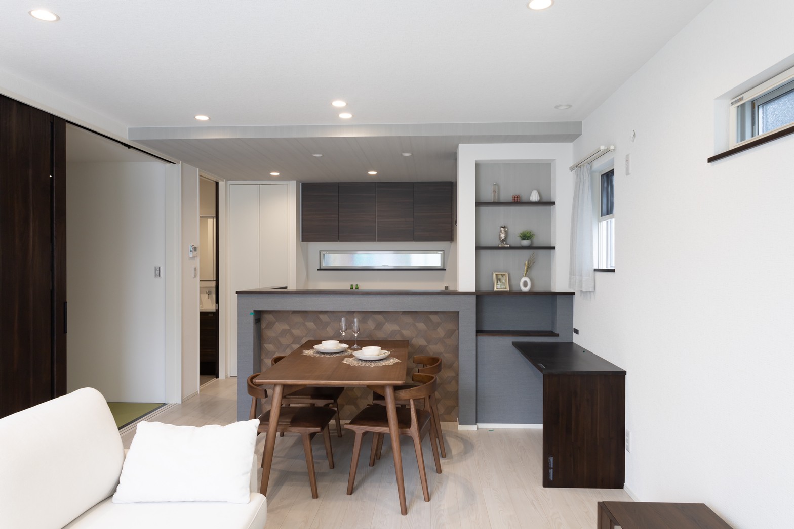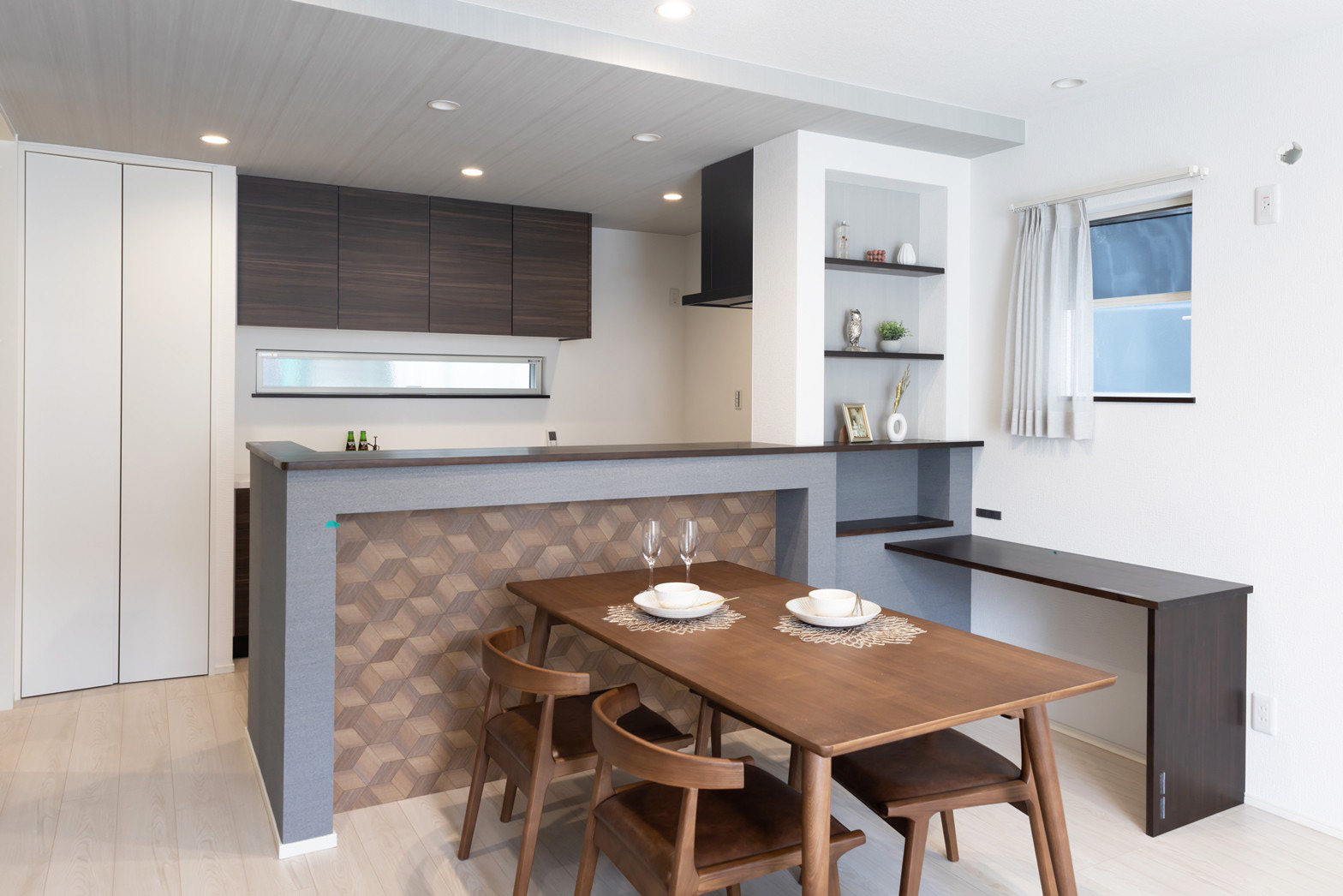三角屋根が目を引く外観。内装はブラウンでコーディネートし、落ち着く空間に。適材適所に収納を設けた心地よい家。