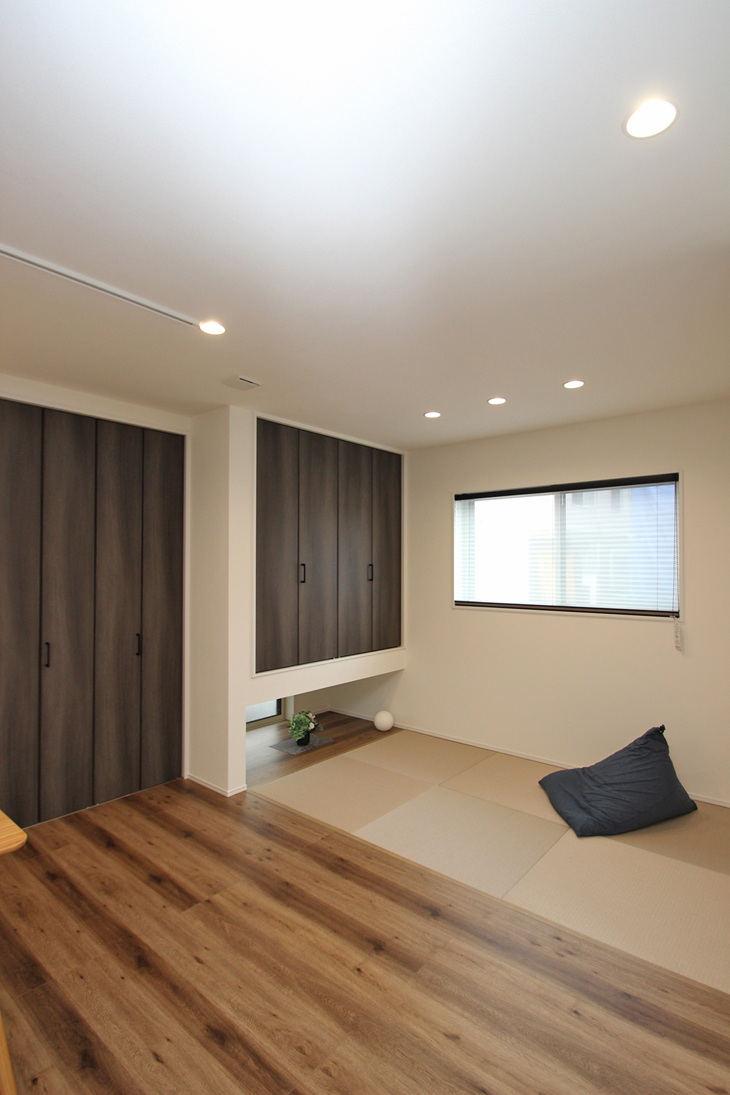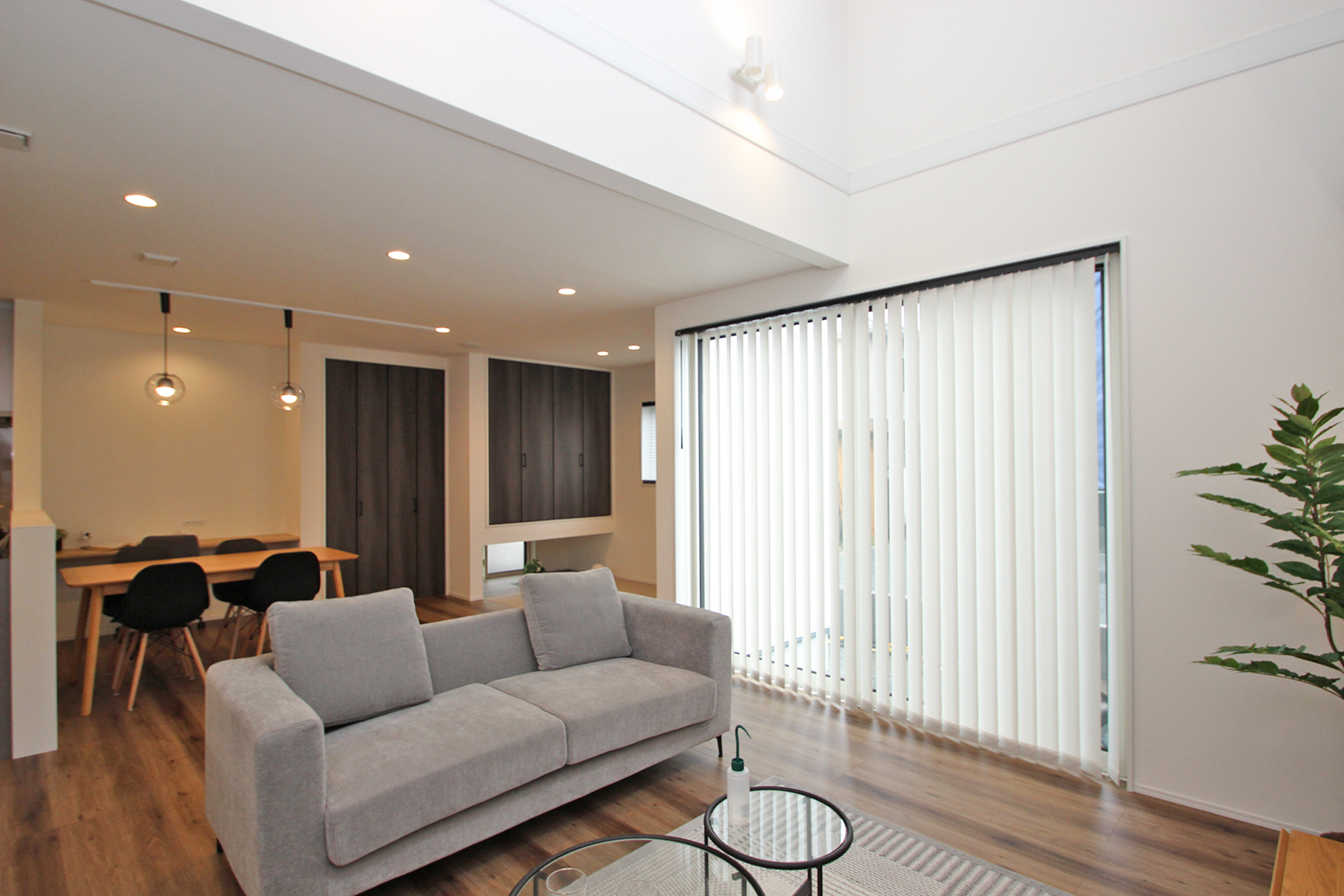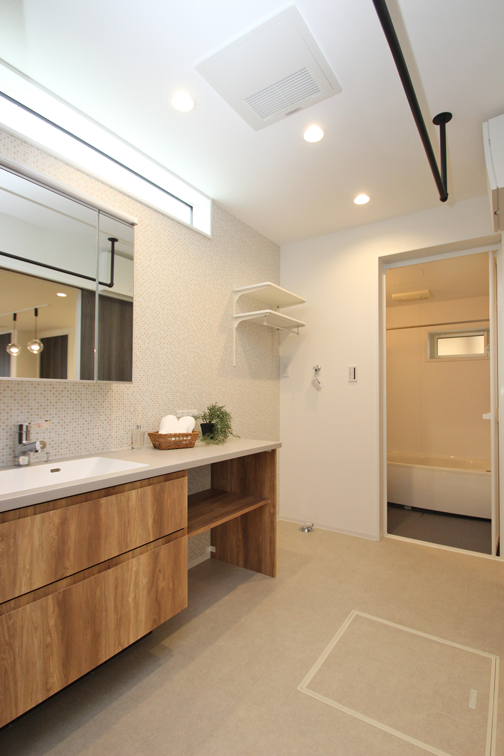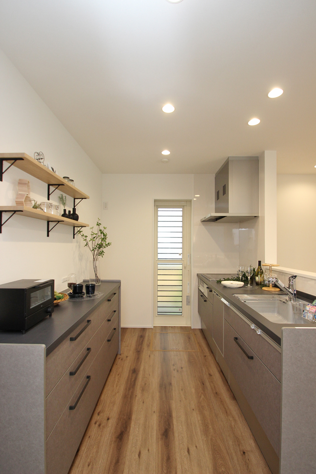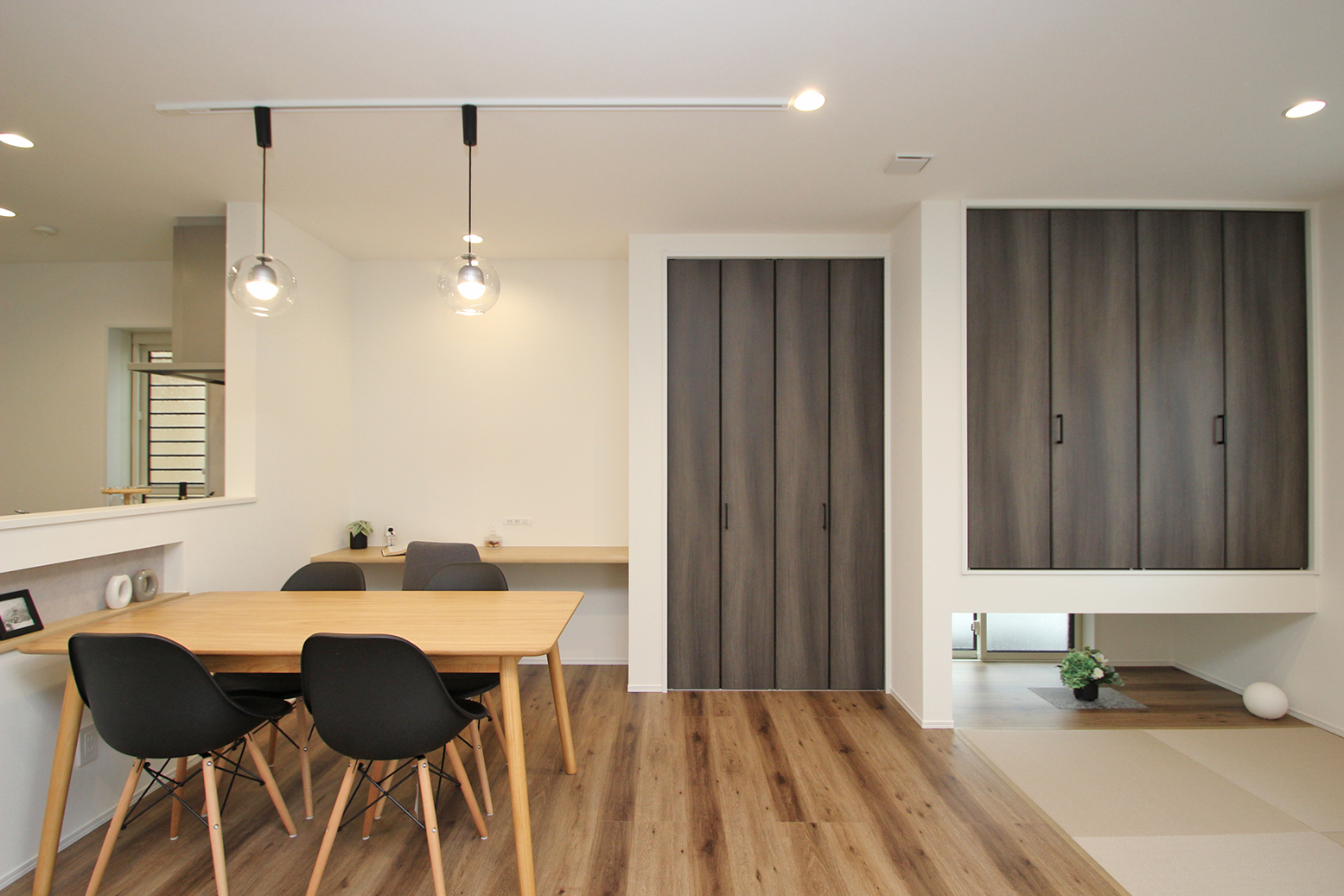 吹き抜け上部の大きな窓や吊戸棚下の地窓は採光性だけでなくデザイン性をアップさせる。2階ホールにオープンな書斎スペースを設置。LDKには広めの造作カウンター、2つの洋室にもそれぞれカウンターが。仕事や勉強に集中したい時、家族の気配を感じながら作業したい時などシチュエーションに合わせて選択が可能◎