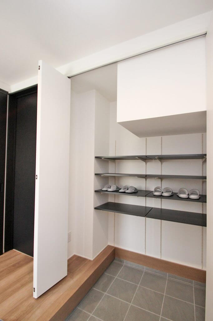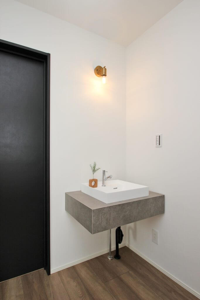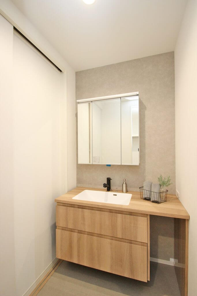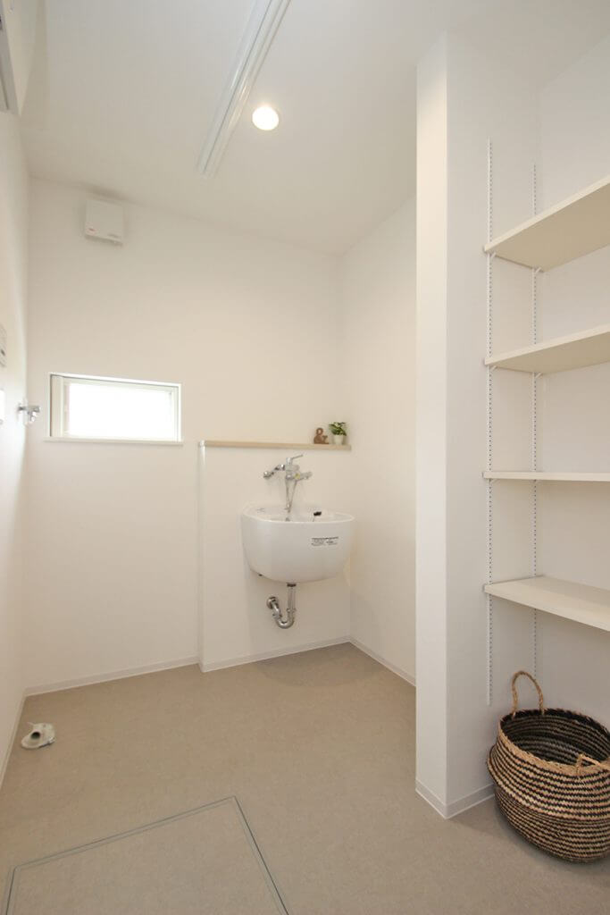 雑多になりがちなLDKの各所には、パントリーなど豊富な収納を設置。洗濯・乾燥・収納を1ヶ所に集約した1Fのみで完結する家事楽動線。脱衣室には、洗濯の際に便利なスロップシンクも◎