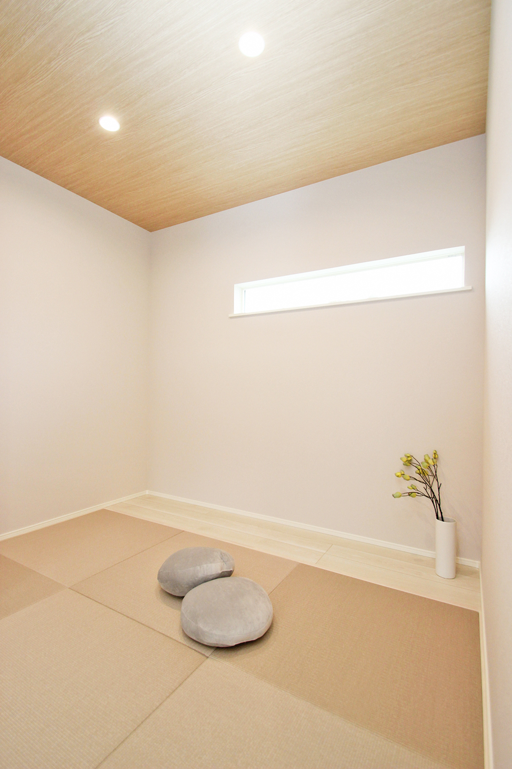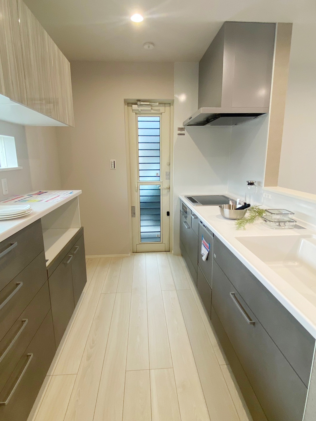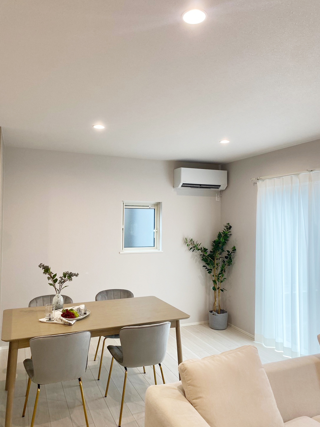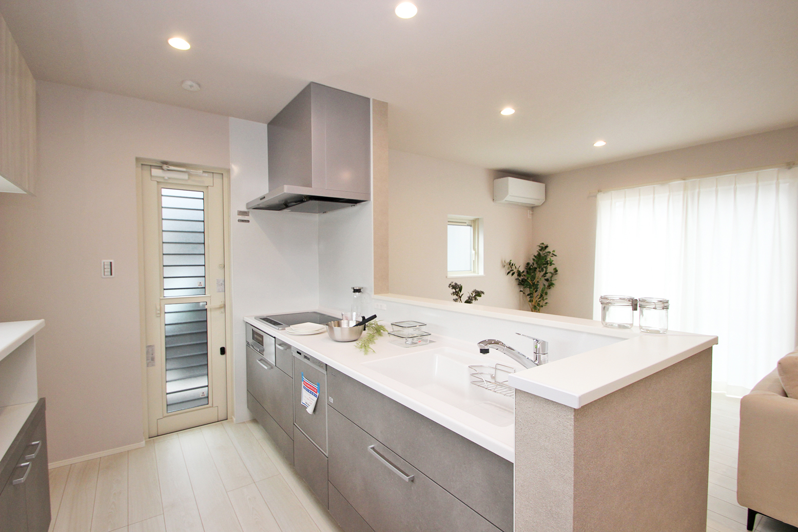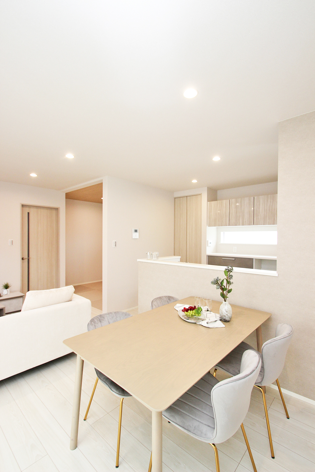 ホワイト・グレージュをベースにした内装に木目を取り入れてぬくもり感じるLDK空間。LDK全体を見渡せるカウンターキッチンやリビング続きの和室など、家族だんらんを叶える住まい◎