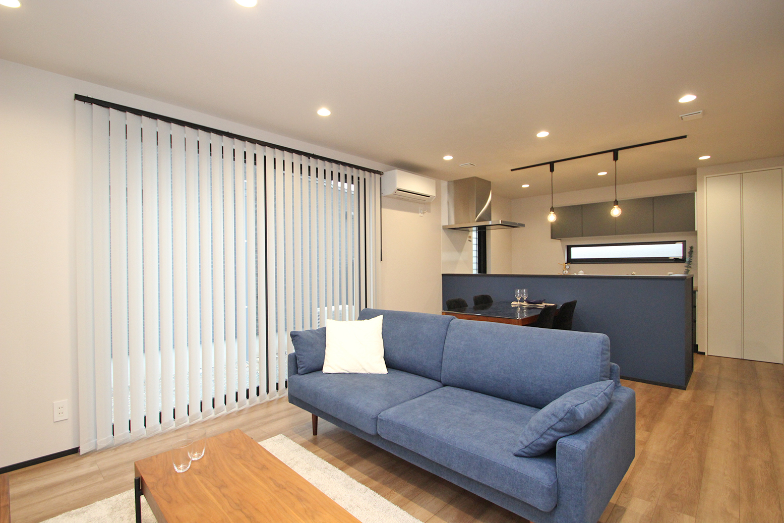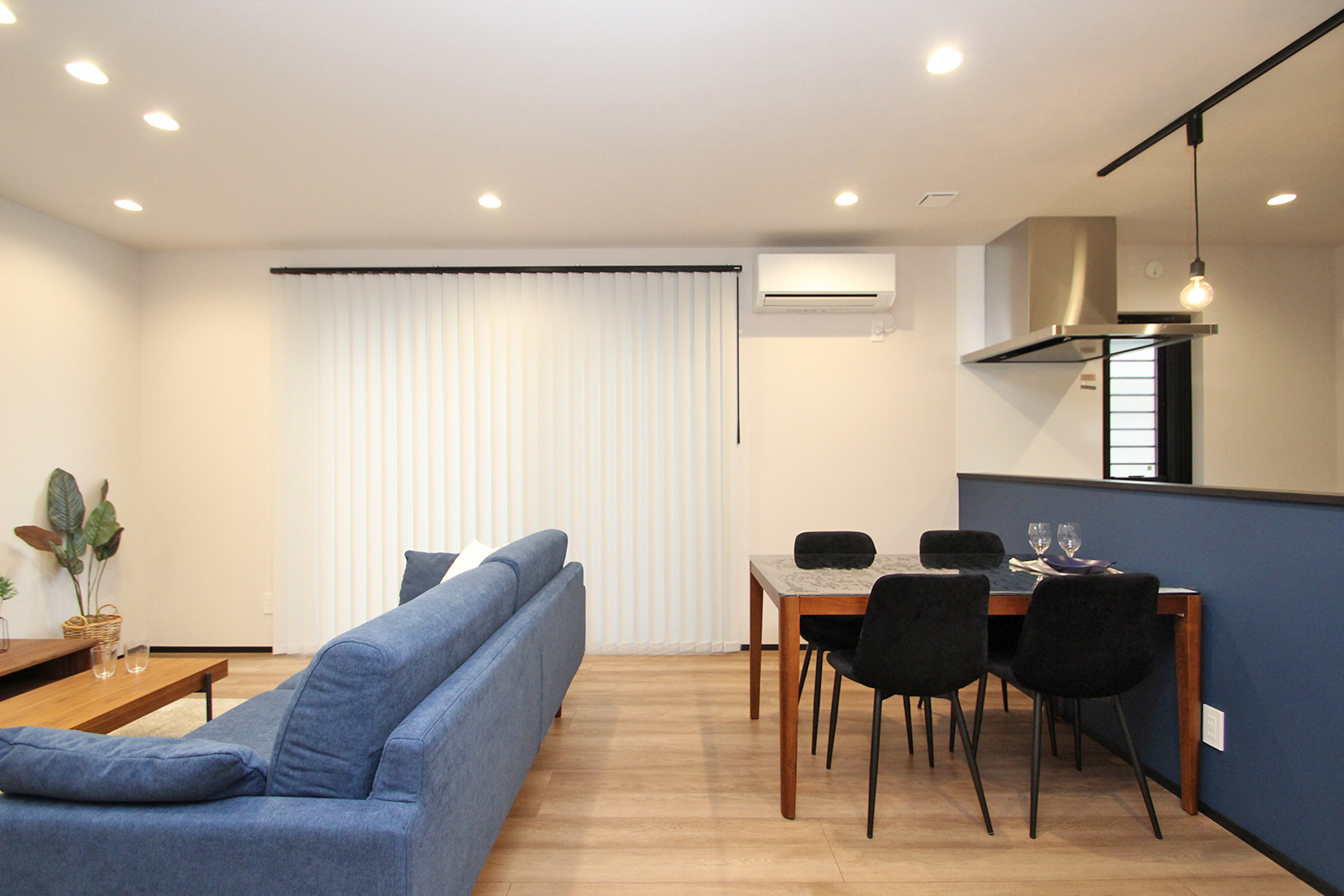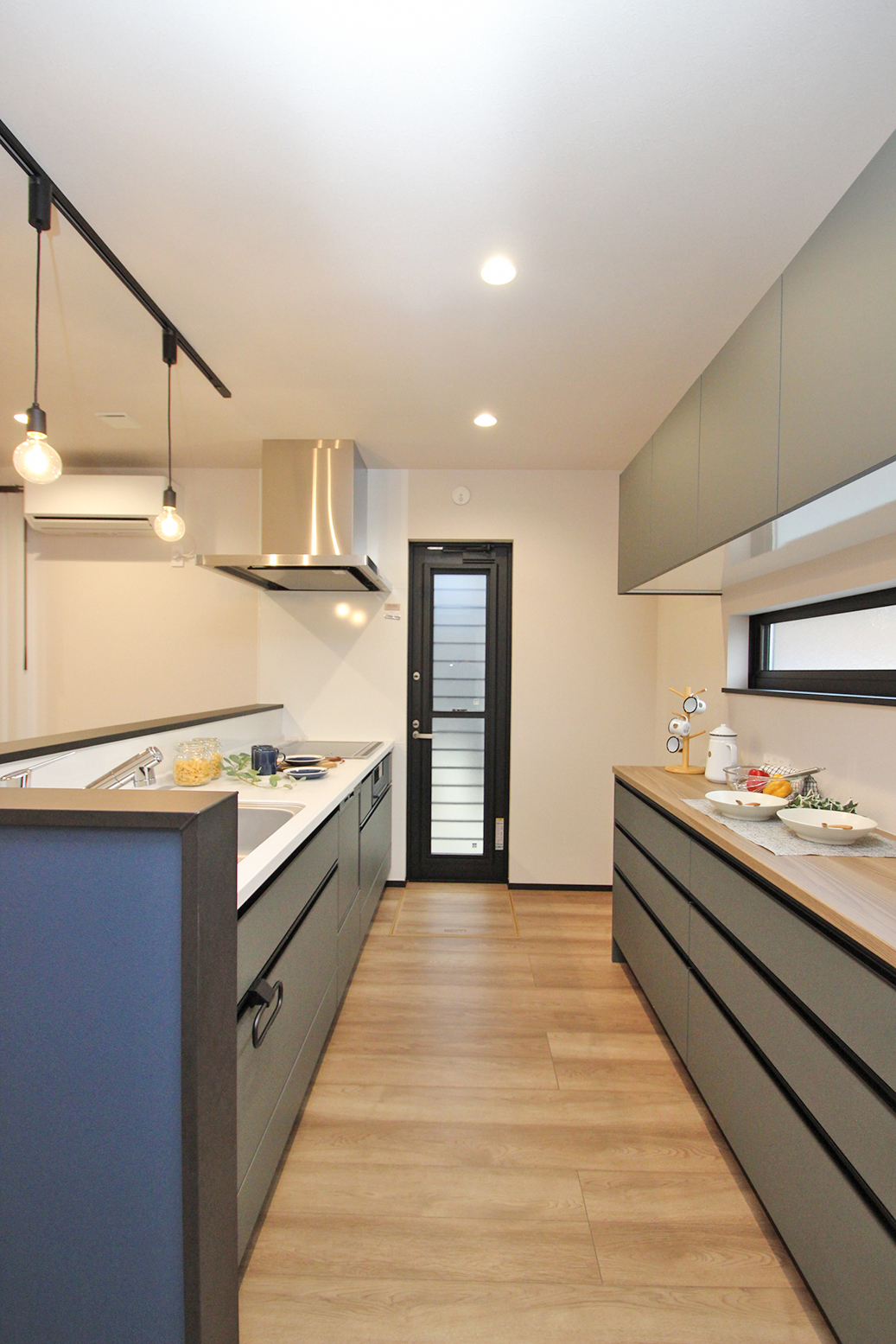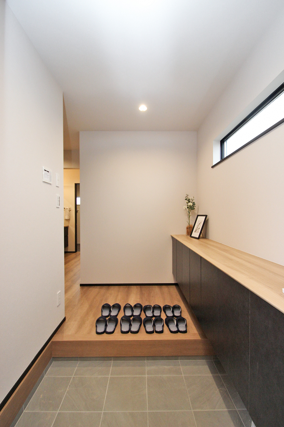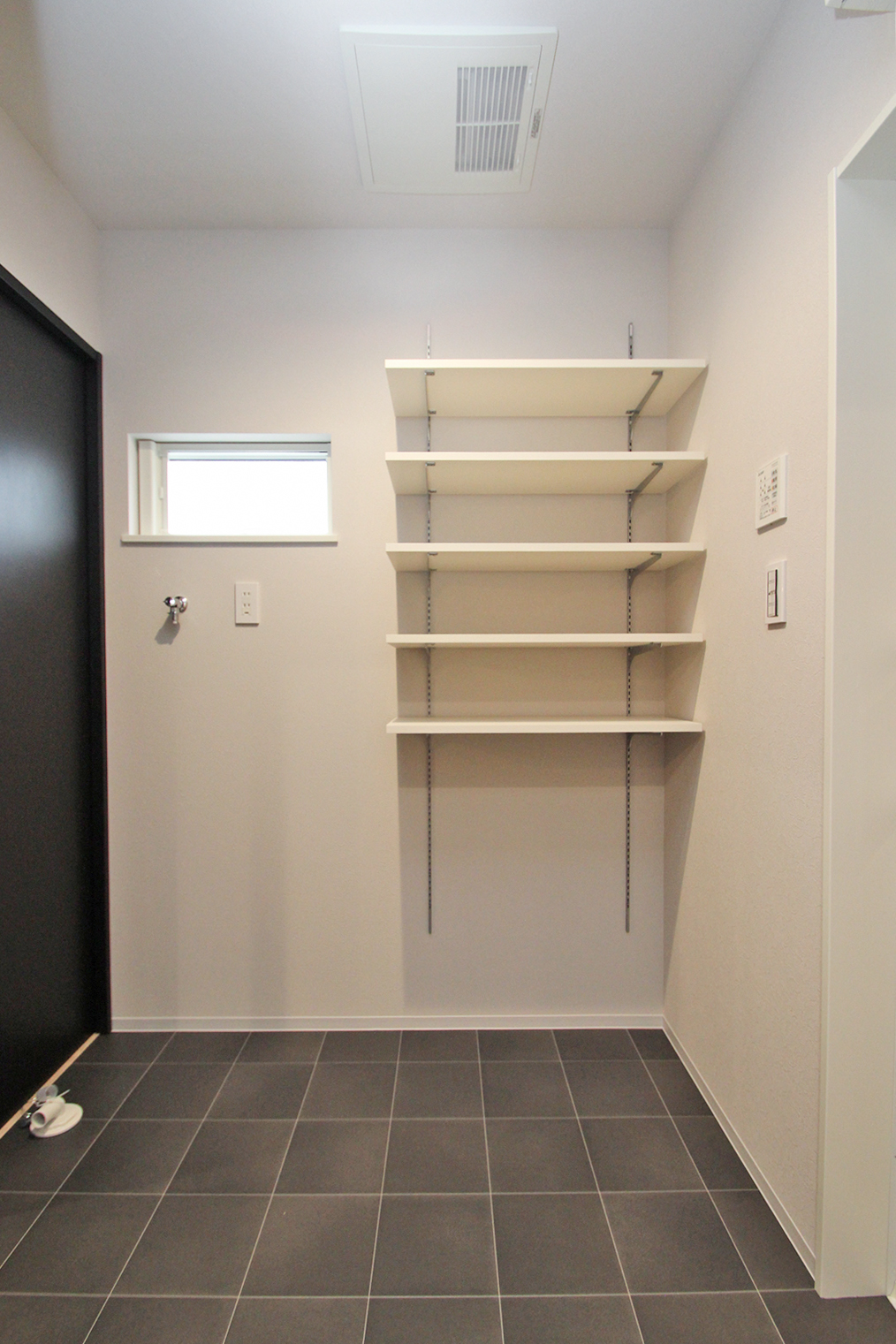室内窓が可愛らしいアクセントになっている洗面室は、玄関からアクセスできる「ただいま動線」が考えられた快適な間取り。洗面室からは脱衣室・ファミリークローゼットへアクセスでき、ワンフロアで洗濯家事が完結する住まい。