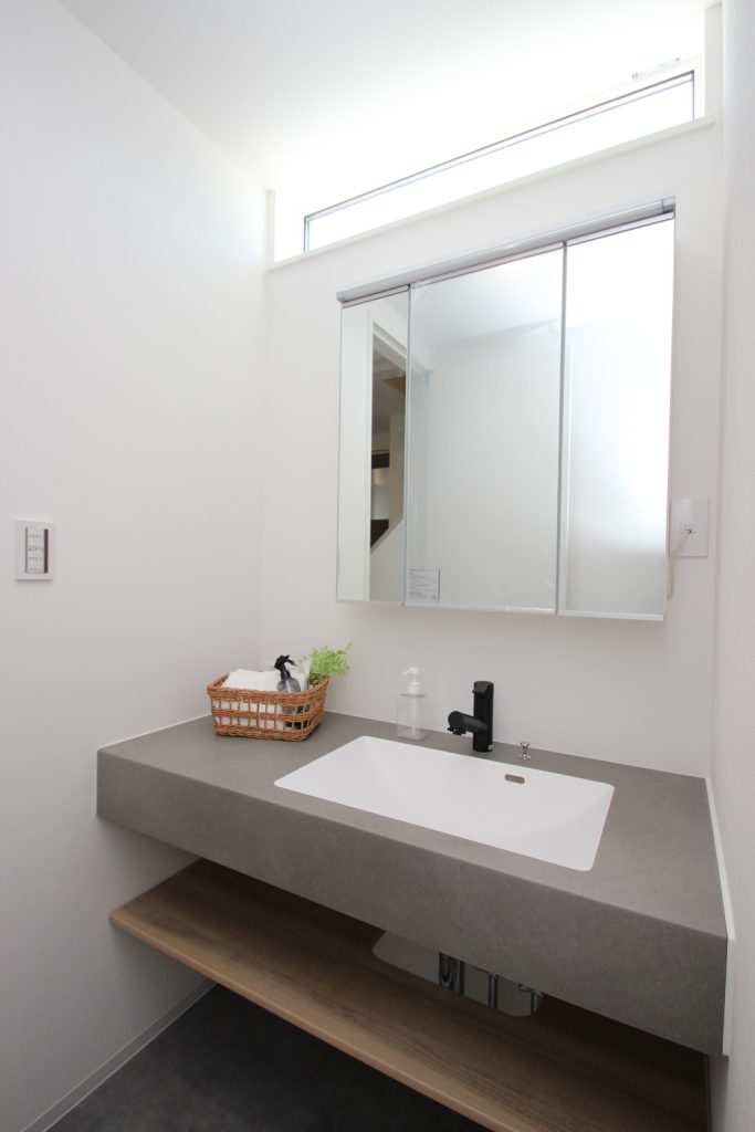 玄関から洗面脱衣室→ファミクロ→LDKへアクセスできる「ただいま動線」のある快適な間取り。独立洗面台は石目調カウンターが高級感を演出します。
