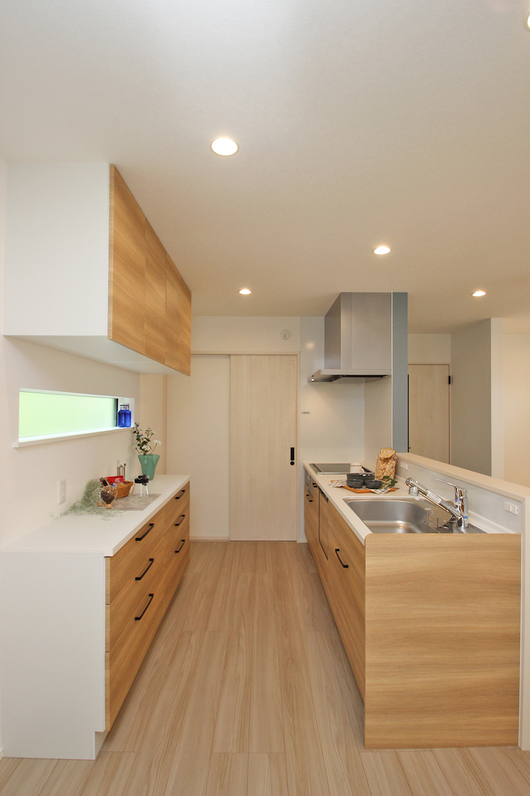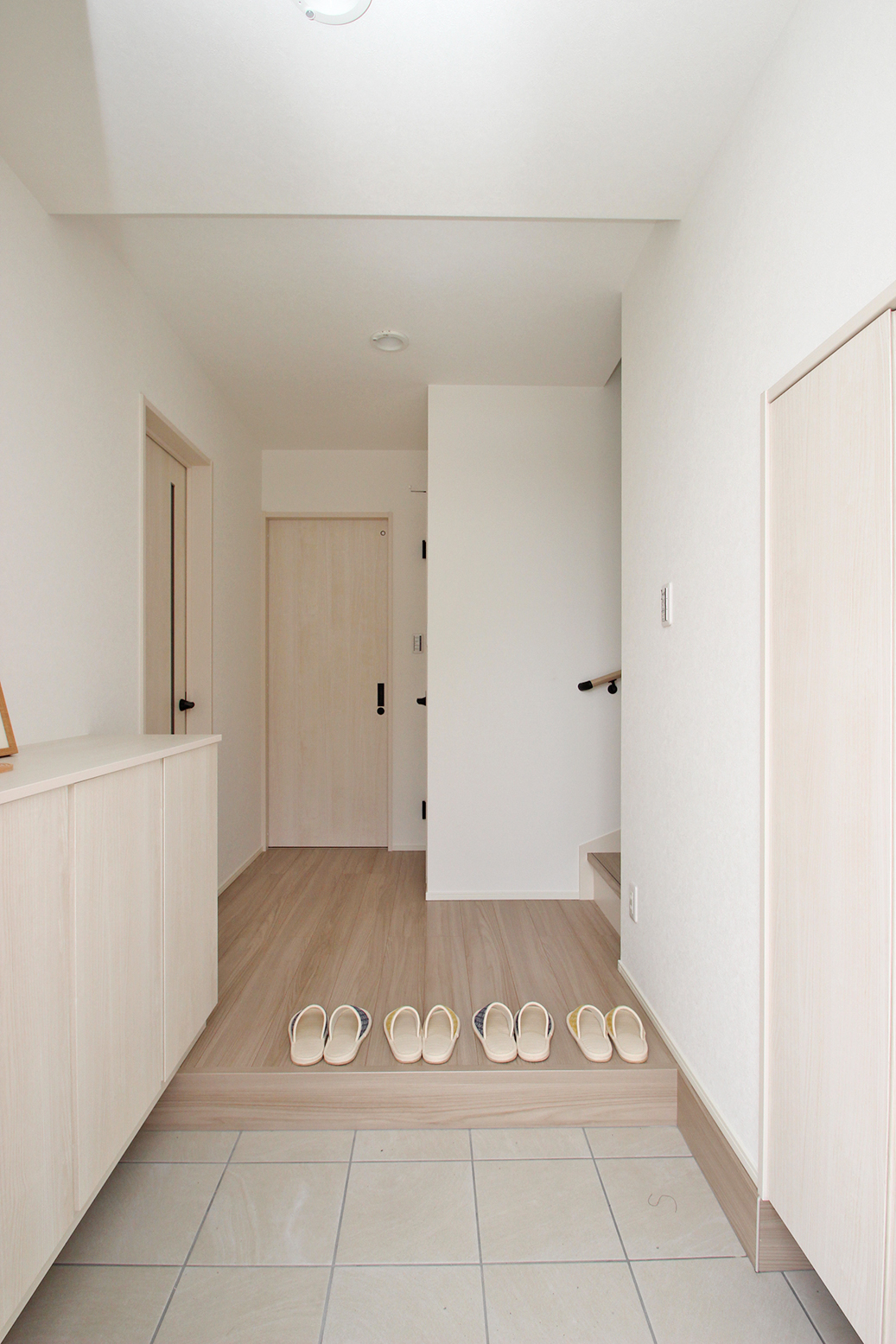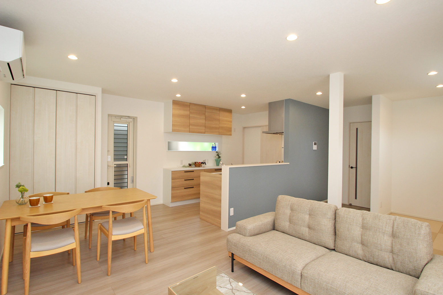ホワイトの外壁で明るく、清潔感のある外観はシンプルながら洗練されたデザイン。LDKはブルーのアクセントクロスが爽やかな印象を与えてくれる。木目の家具とマッチしてナチュラルで柔らかい雰囲気◎