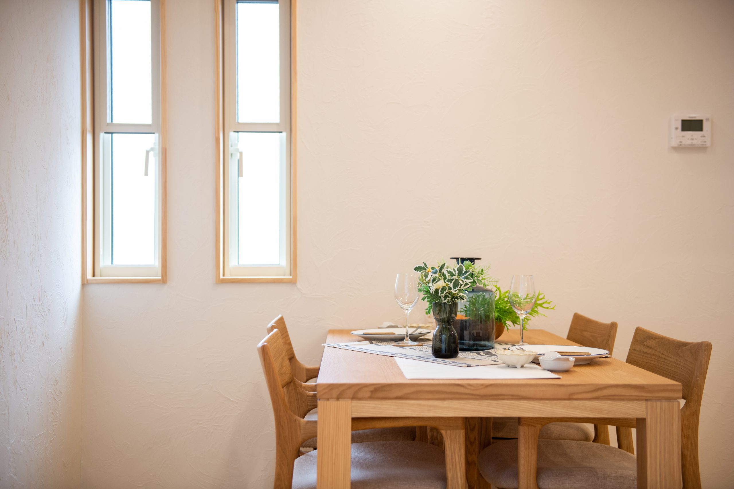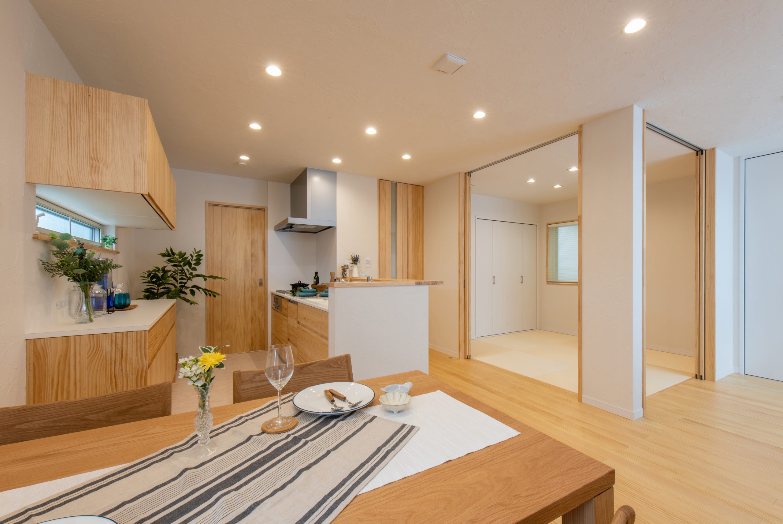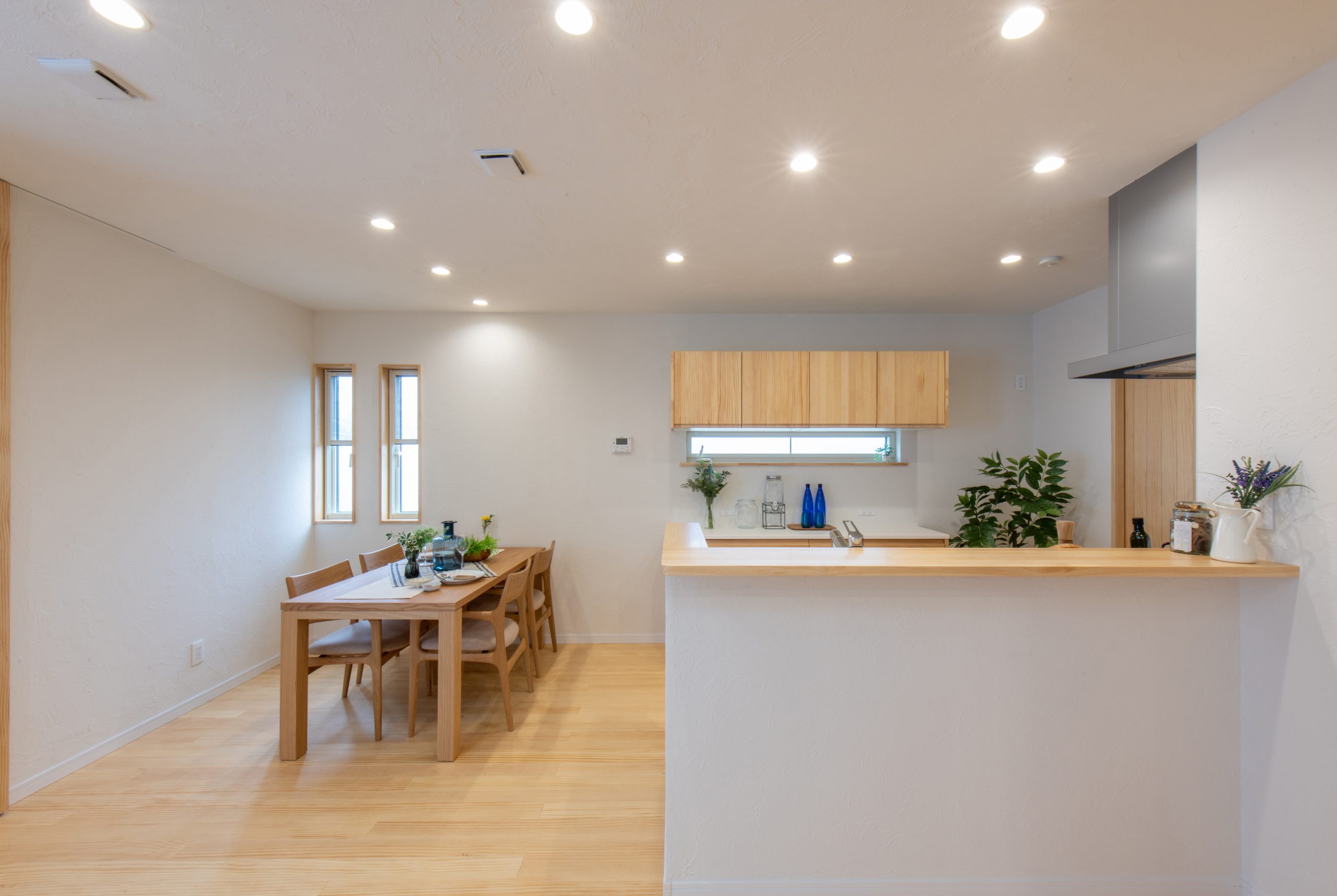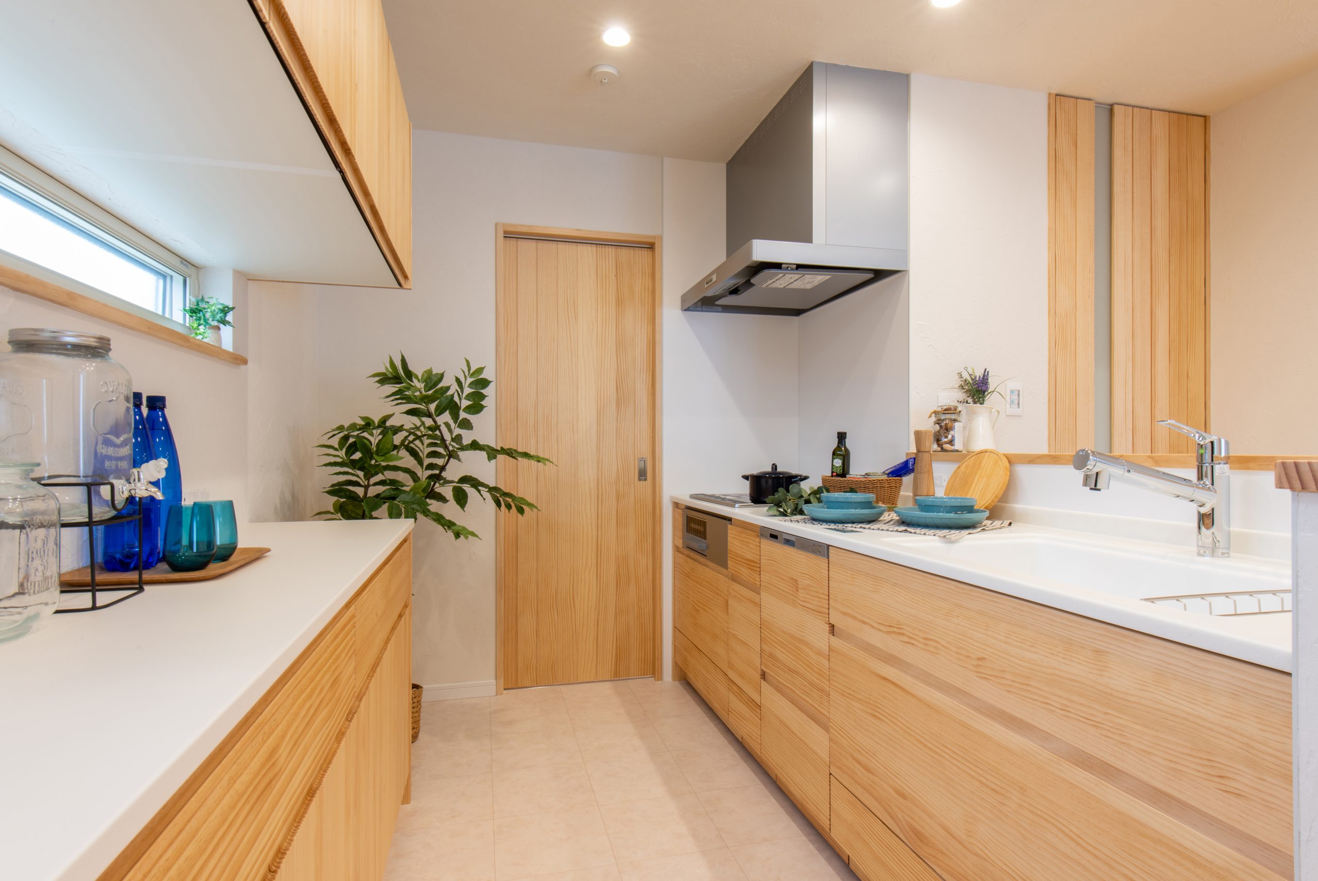 「ナチュラルスタイル」をコンセプトにした無垢材使用の木の香りに包まれる住まい。無垢材を使用したキッチンや壁はクロスではなく塗り壁材を採用するなど、自然素材の魅力と落ち着いた風合いを感じられる。