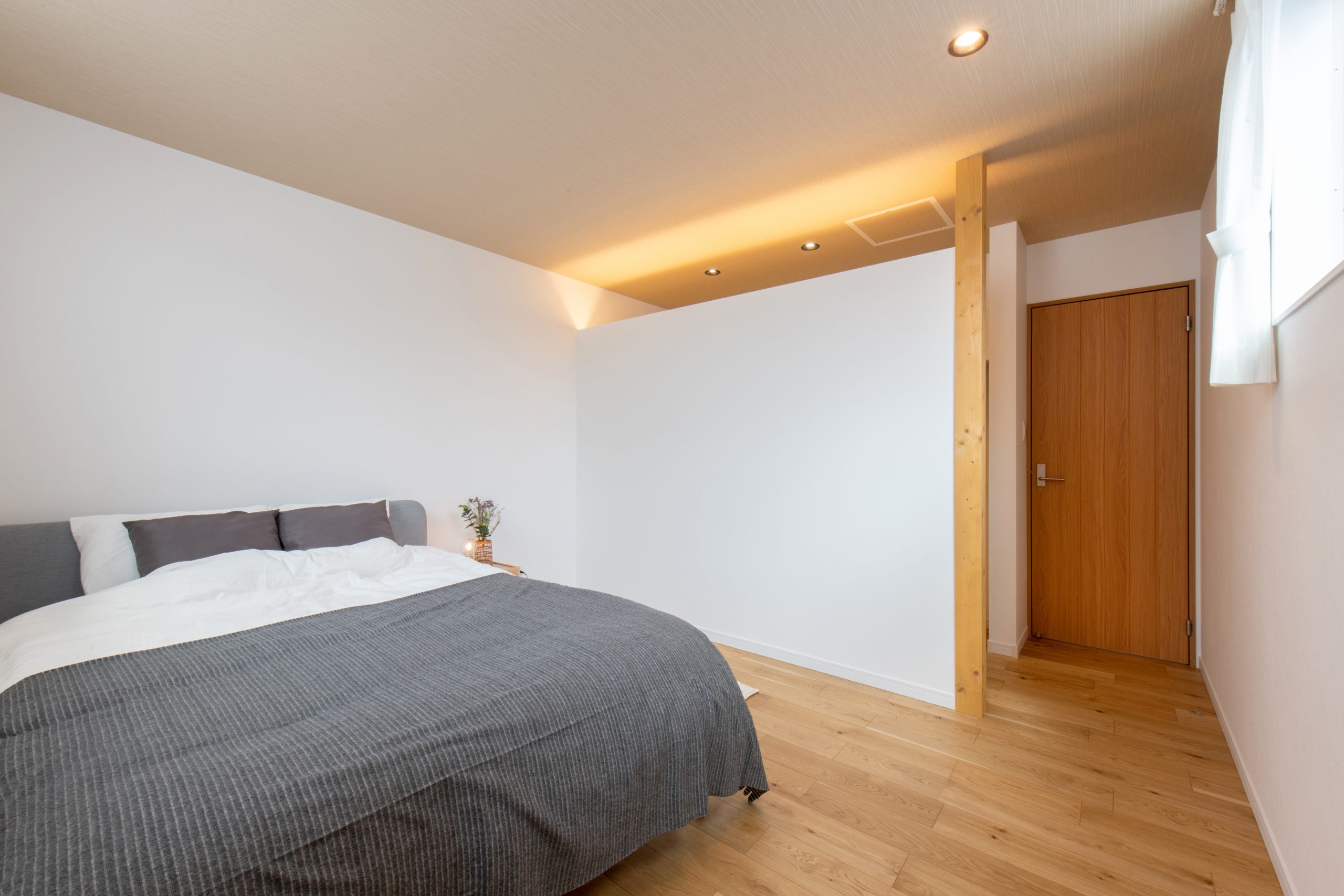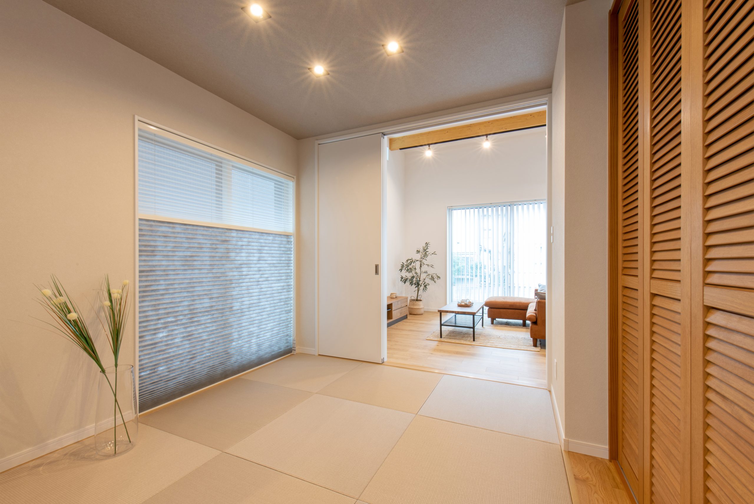 広々とした玄関ホールから和室→LDKへと縦に並んだ間取り。扉を開放することで、風が抜けるここちいい空間。高天井の化粧梁が存在感を放つ開放的なLDKは木のぬくもり感じるデザインでご家族みんなの憩いの場に。