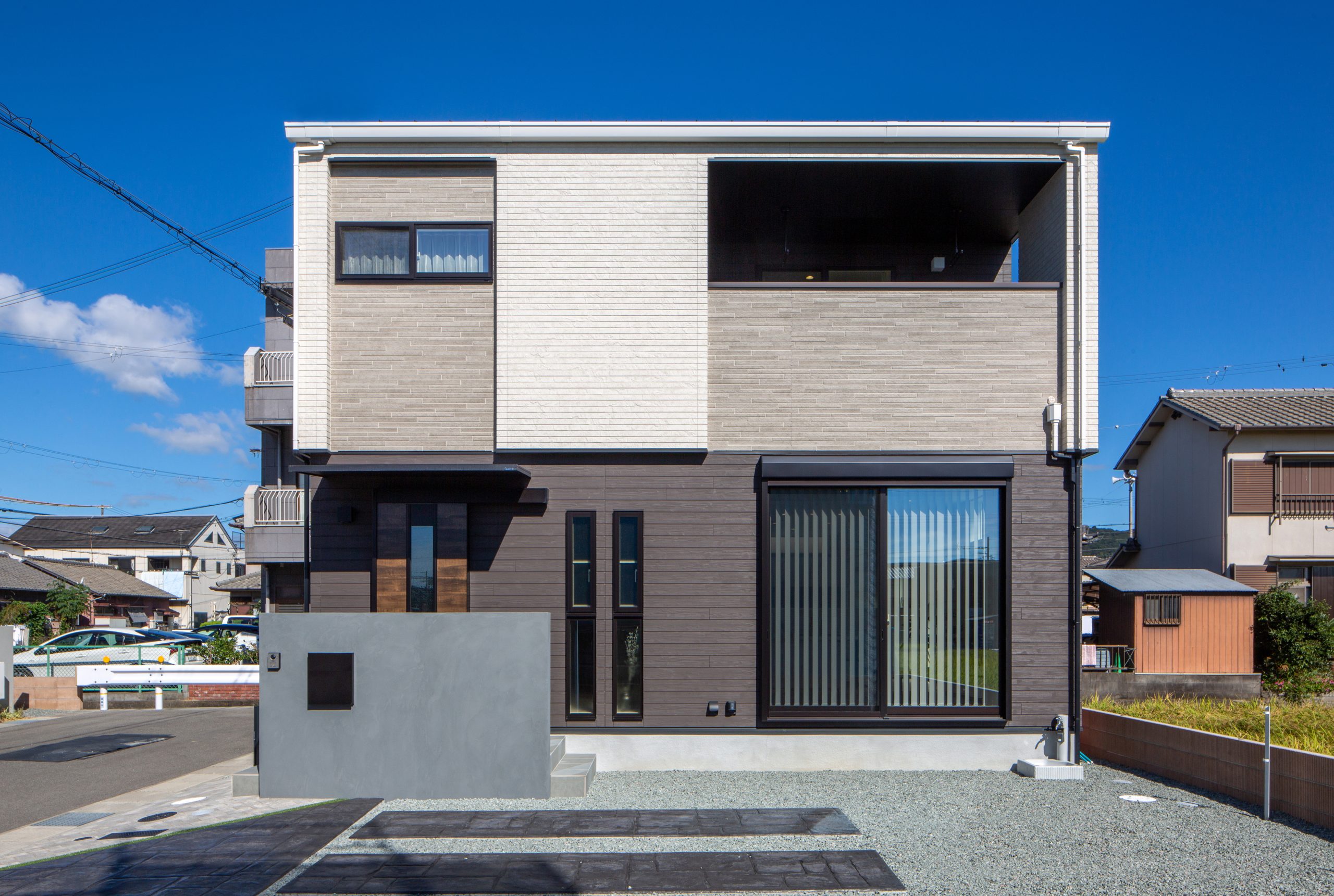 木目柄と石目柄の高級感のある外観が目を引く住まい。内装はホワイトを基調にグレーが映える落ち着く空間。